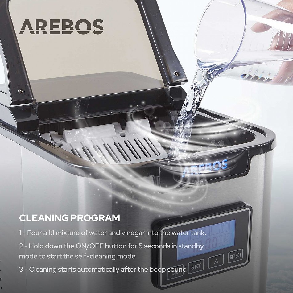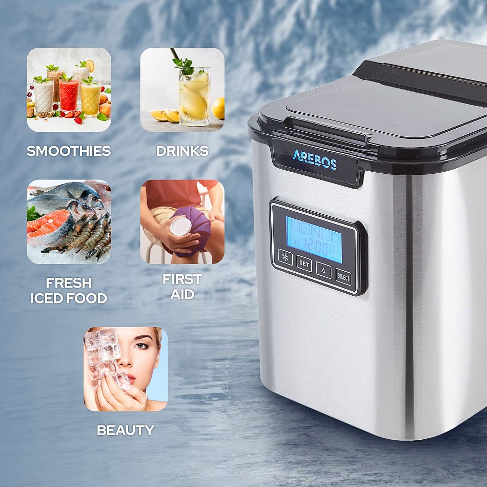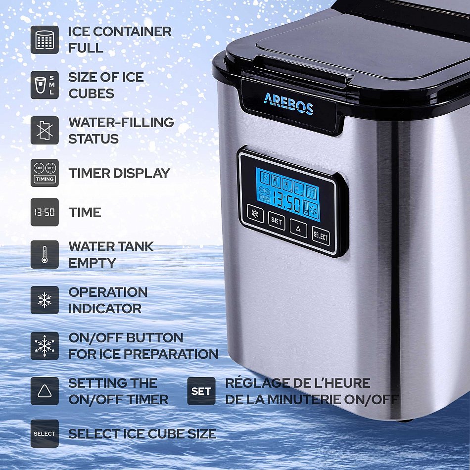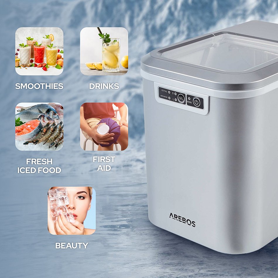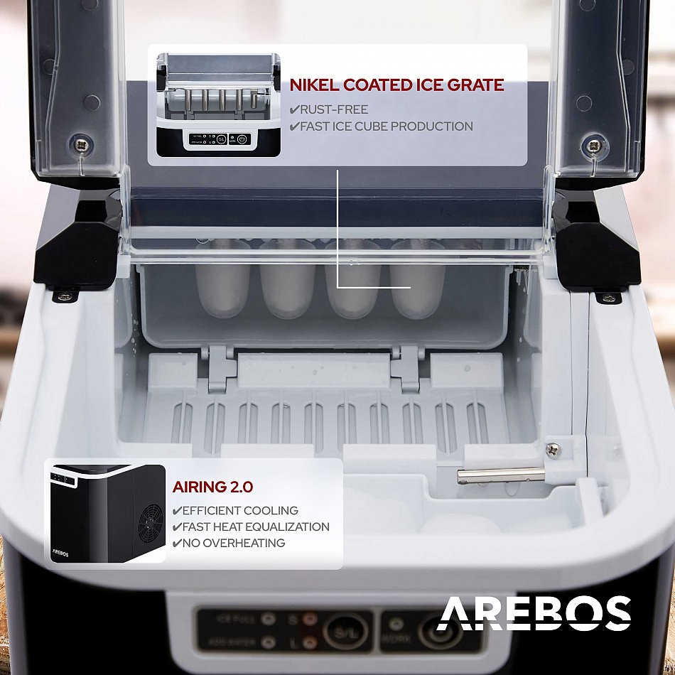 Quest’apparecchio di AREBOS rende la produzione di cubetti di ghiaccio facile, perfetta ed altamente efficiente, permettendoti di preparare bevande rinfrescanti in modo rapido e semplice alle feste, in ufficio o in qualsiasi altro luogo. Perfetto per caffè freddi, rinfrescanti frullati di frutta o bevande fresche nelle calde giornate estive!