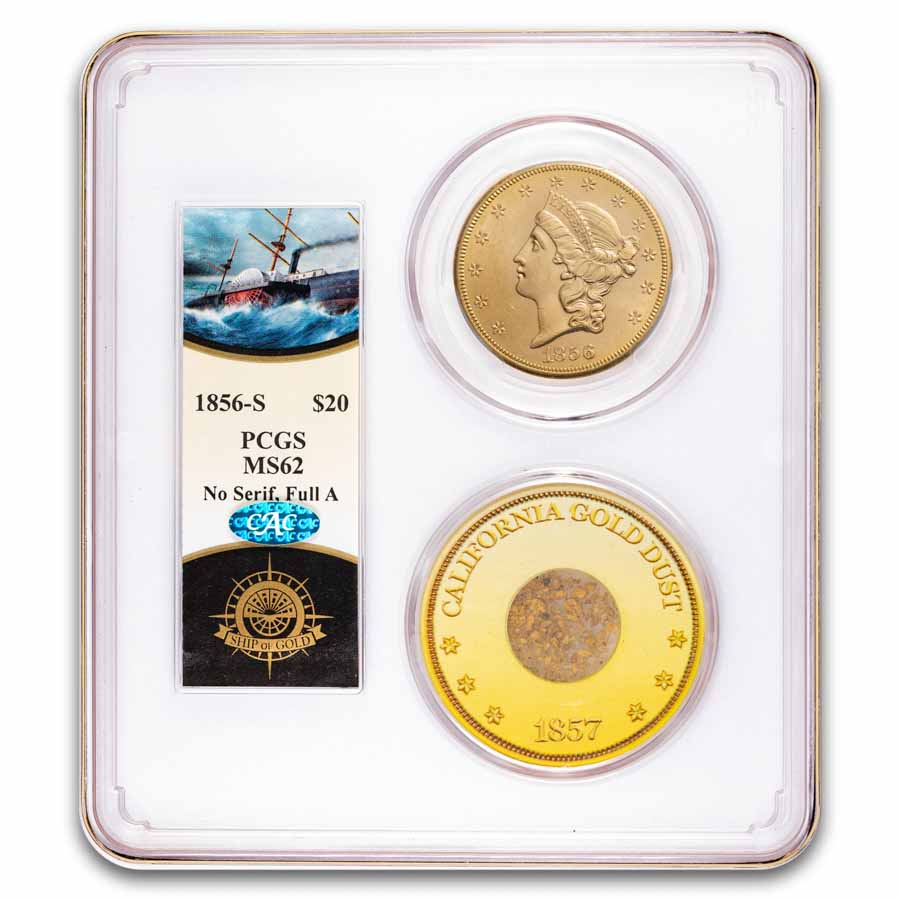 - Authenticated and graded MS-62 by PCGS with the special Ship of Gold slab. This slab includes a pinch of California Gold Dust.