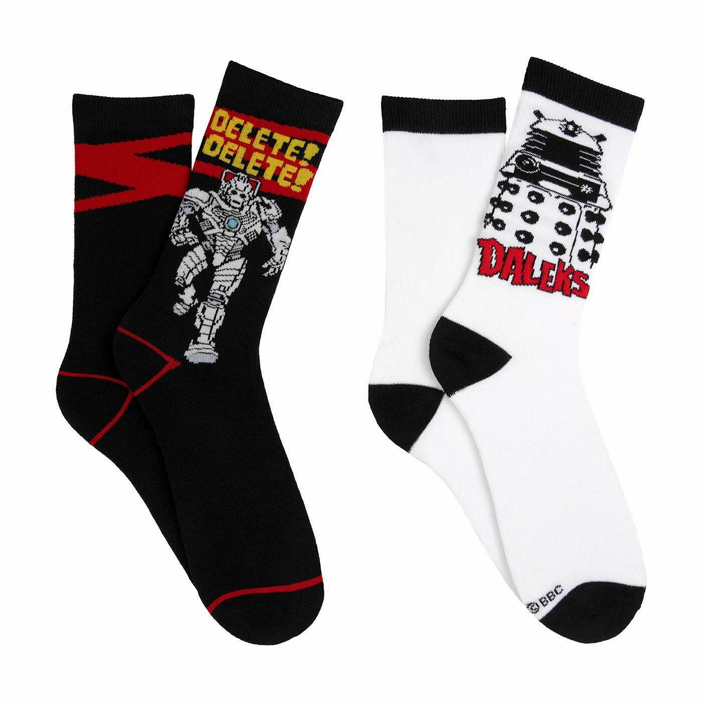 Express your enjoyment of the Doctor Who series with crew socks featuring two of the most well-known villains among show fans. The Daleks are always scheming to dominate everywhere, and you can pay homage to their long-standing dominance as super villains. The Cybermen represent the loss of everything that makes us human. These socks are a reminder to value humanity when pursuing technological advancements.