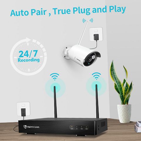 HeimVision HM241 Wireless Security Camera SystemWireless Surveillance System is perfect for monitoring large areas like villa, home, office, shop, hotel, warehouse, school, business or elsewhere (outdoor/ indoor). Allow you to protect your property from the comfort of your smartphone, putting your property under surveillance with no worry.Auto paired and Easy Setup The wireless cameras and NVR are auto paired during the factory setting.