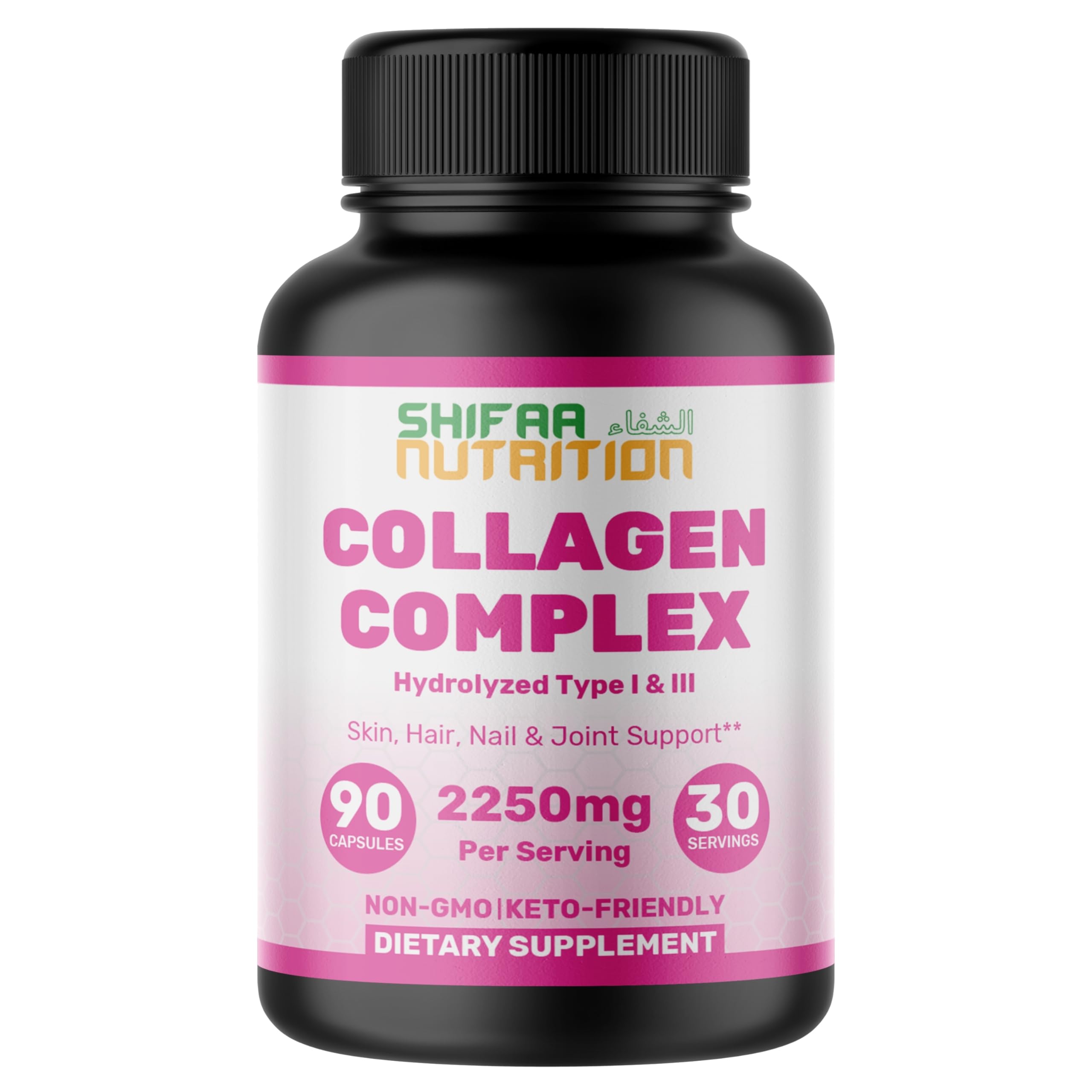 Introducing SHIFAA NUTRITION's HALAL COLLAGEN COMPLEX CAPSULES, crafted with care, our collagen capsules for women and men offer a potent blend of Type I & III Hydrolyzed Bovine Collagen. With 90 capsules per bottle, each serving provides the nourishment needed to maintain strong hair, glowing skin, and healthy nails. Our product is a testament to quality, made for those seeking grass-fed collagen for women and men. Collagen is an essential protein for our bodies, responsible for maintaining strength of our skin, hair, and nails. SHIFAA NUTRITION's collagen supplement is specifically formulated to support joint health and immune function. Our HALAL COLLAGEN COMPLEX CAPSULES are crafted with care, adhering to strict halal standards, making them suitable for everyone, including those seeking halal collagen supplements. Whether you are looking for collagen for women or collagen supplements for men, our collagen peptides for women and men are designed to meet your needs. Experience the benefits of collagen hydrolyzed, which supports hair, nails and skin. SHIFAA NUTRITION's collagen complex capsules are ideal for those seeking a comprehensive approach to beauty and wellness. Elevate your daily health regimen with our collagen peptides capsules.
