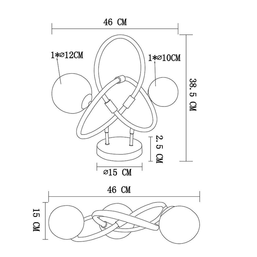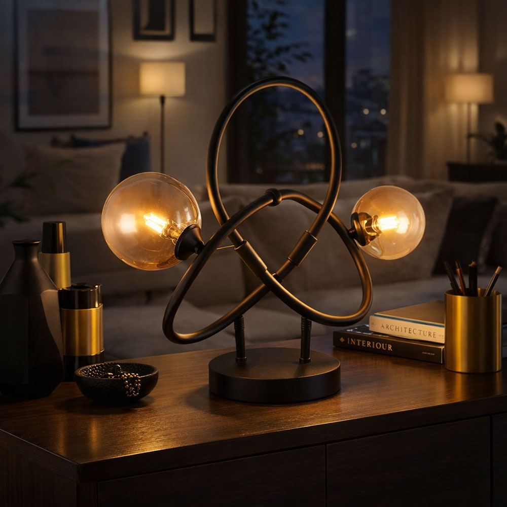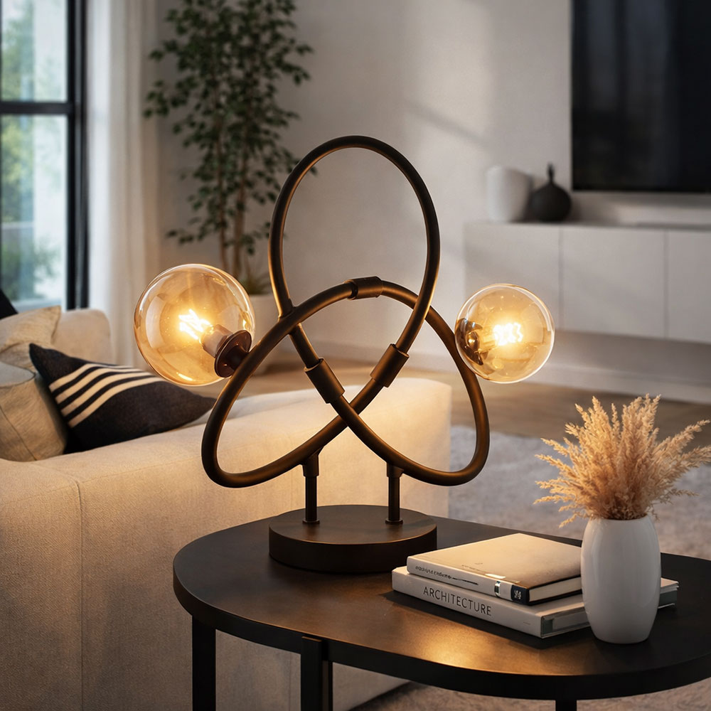 La lampe de table incurvée avec différentes boules de verre est un accessoire élégant et unique pour n'importe quel bureau ou table d'appoint.