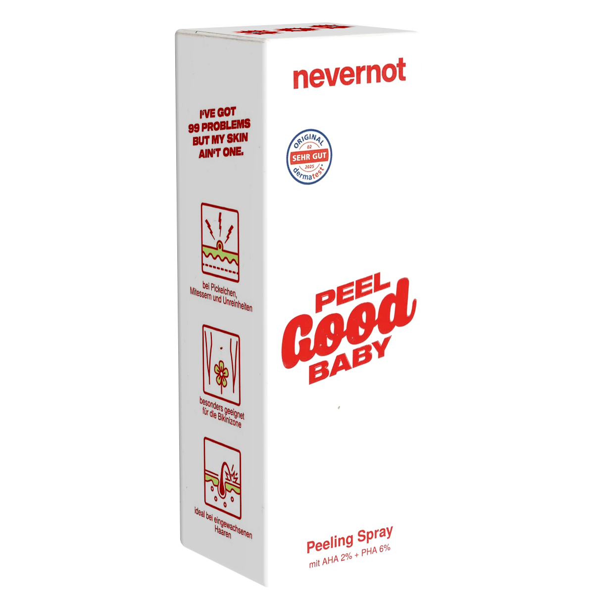 Als Pflegeprodukt der Marke Nevernot wird Peel Good Baby in Deutschland/Frankreich hergestellt. Es ist für den äußeren Intimbereich und die Bikinizone gedacht. Nicht auf verletzter Haut anwenden, Augenkontakt vermeiden, bei Reizungen Anwendung abbrechen. Kein Medizinprodukt.