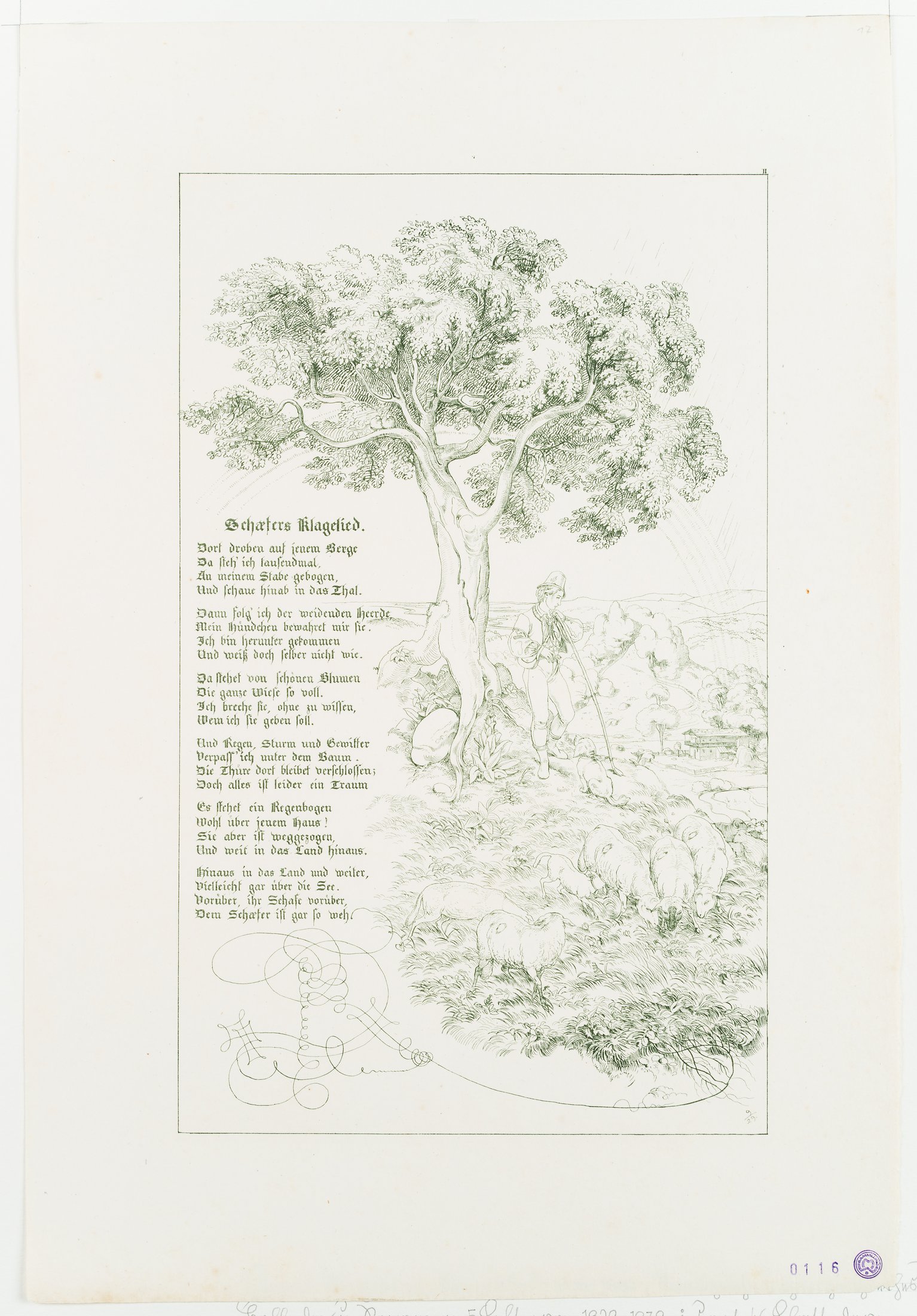 - Description: Beautiful depiction of the pastoral romance. On a hill under a single tree stands a shepherd with a herding dog. In front of him a small flock of sheep is grazing while a rainbow appears in the background. On the left is the text of Johann Wolfgang von Goethe's poem "Schäfers Klagelied" from 1802. From the work "Randzeichnungen zu Goethes Balladen und Romanzen" 1829-1839.