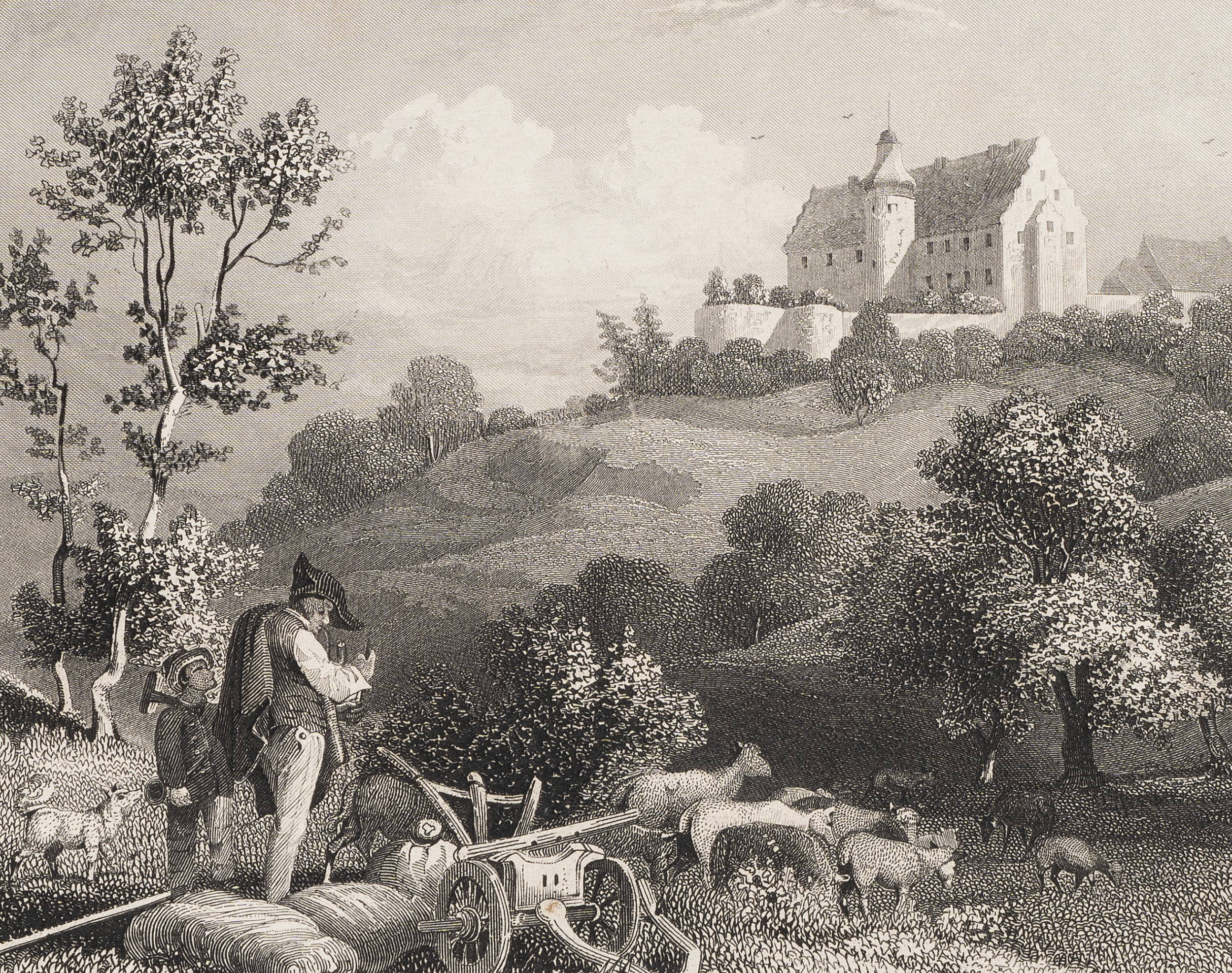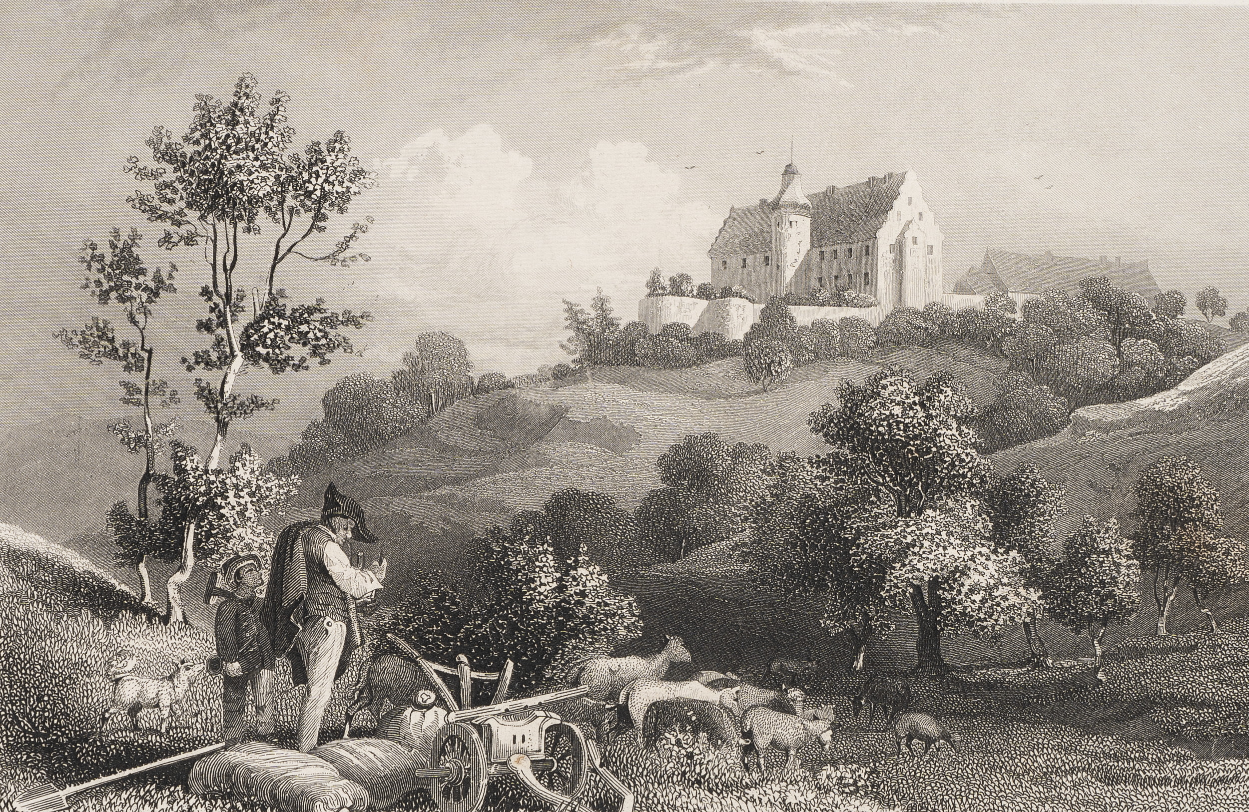 Albert Henry Payne (1812 London - 1902 Leipzig) nach Ludwig Richter (1803 Dresden - 1884 ebd.), Zwei Hirten rasten mit ihrer Herde. Im Hintergrund ist die Bettenburg zu sehen, 19. Jahrhundert, Stahlstich