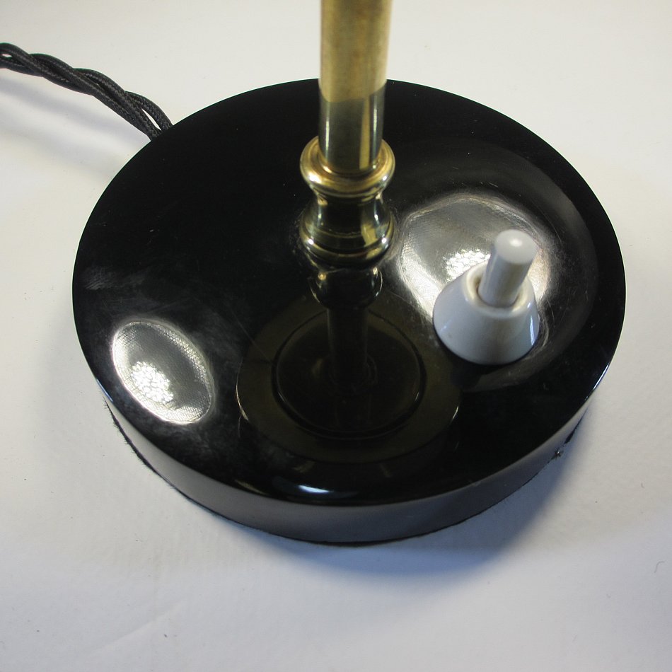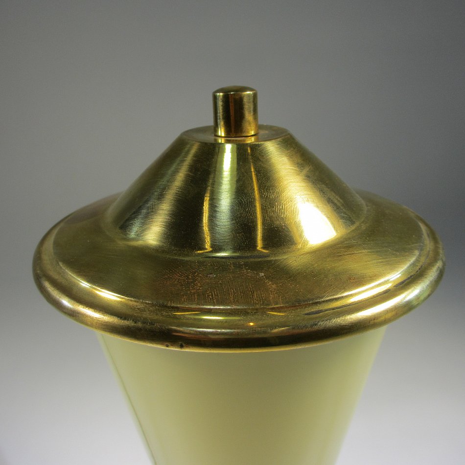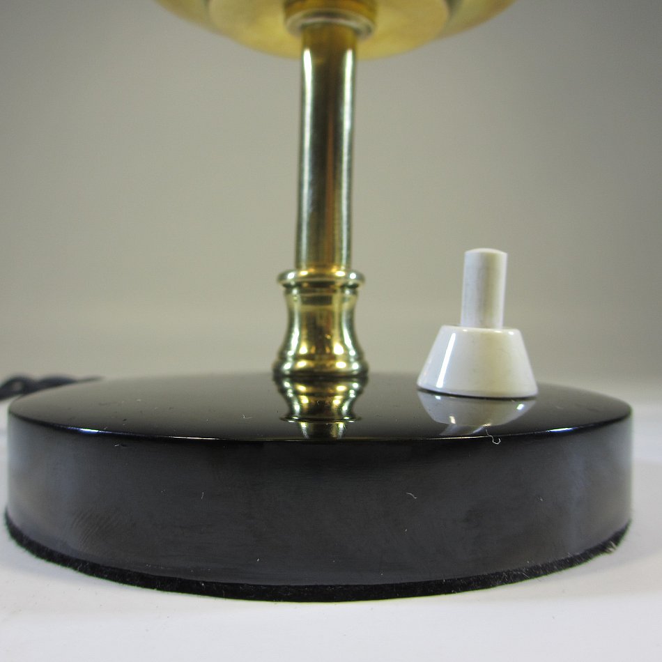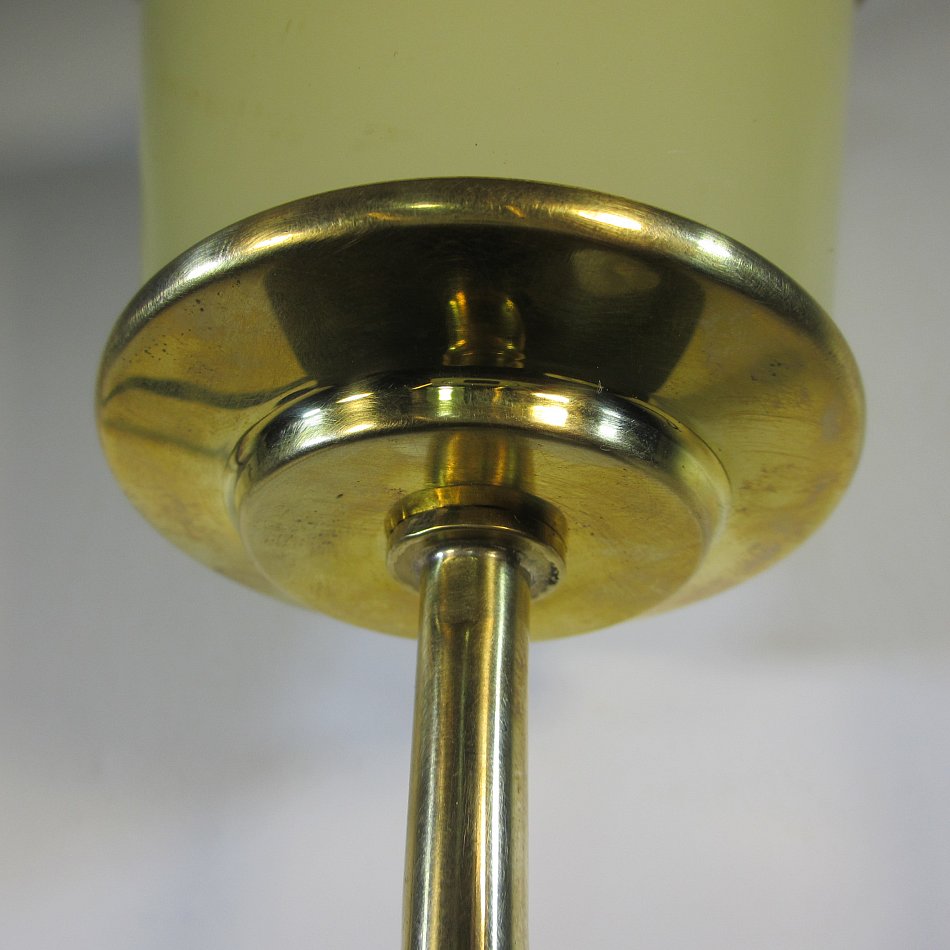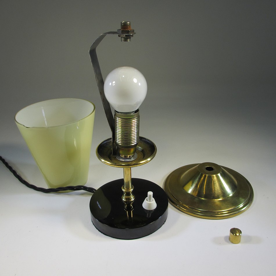Der Lampenfuß besteht aus Holz mit einer Klavierlack Lackierung. Der Tubus Schirm ist aus doppelschichtigen Opalglas innen weiß, außen Cremeweiss/Altweiss ( mit kleinen Chips an der oberen Öffnung, die man nur bei geöffneten Deckel sieht ) Diese Lampe wurde komplett zerlegt, gereinigt, und die Messingteile wieder gereinigt. Die Patina habe ich so belassen, ihr könnt das Messing noch polieren.