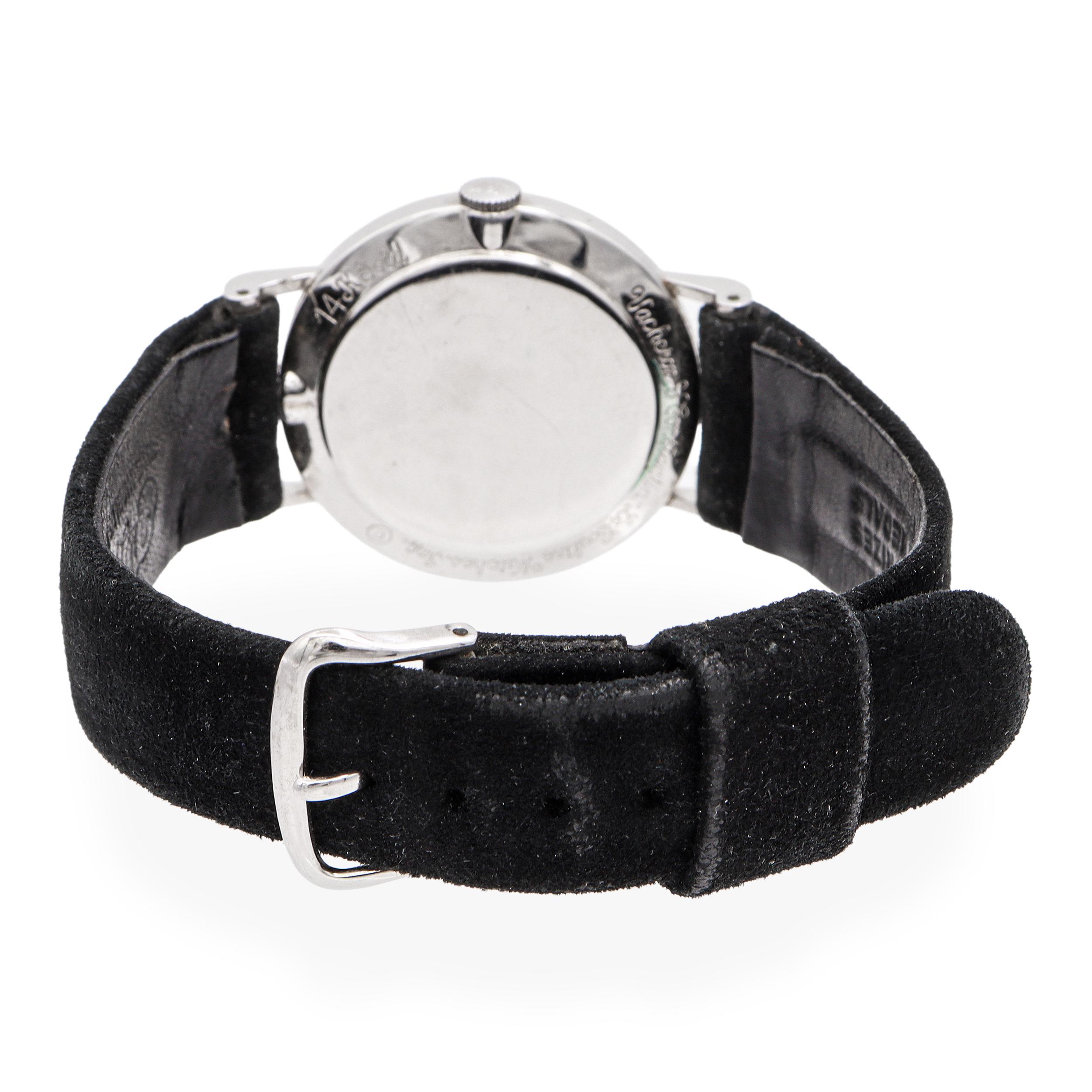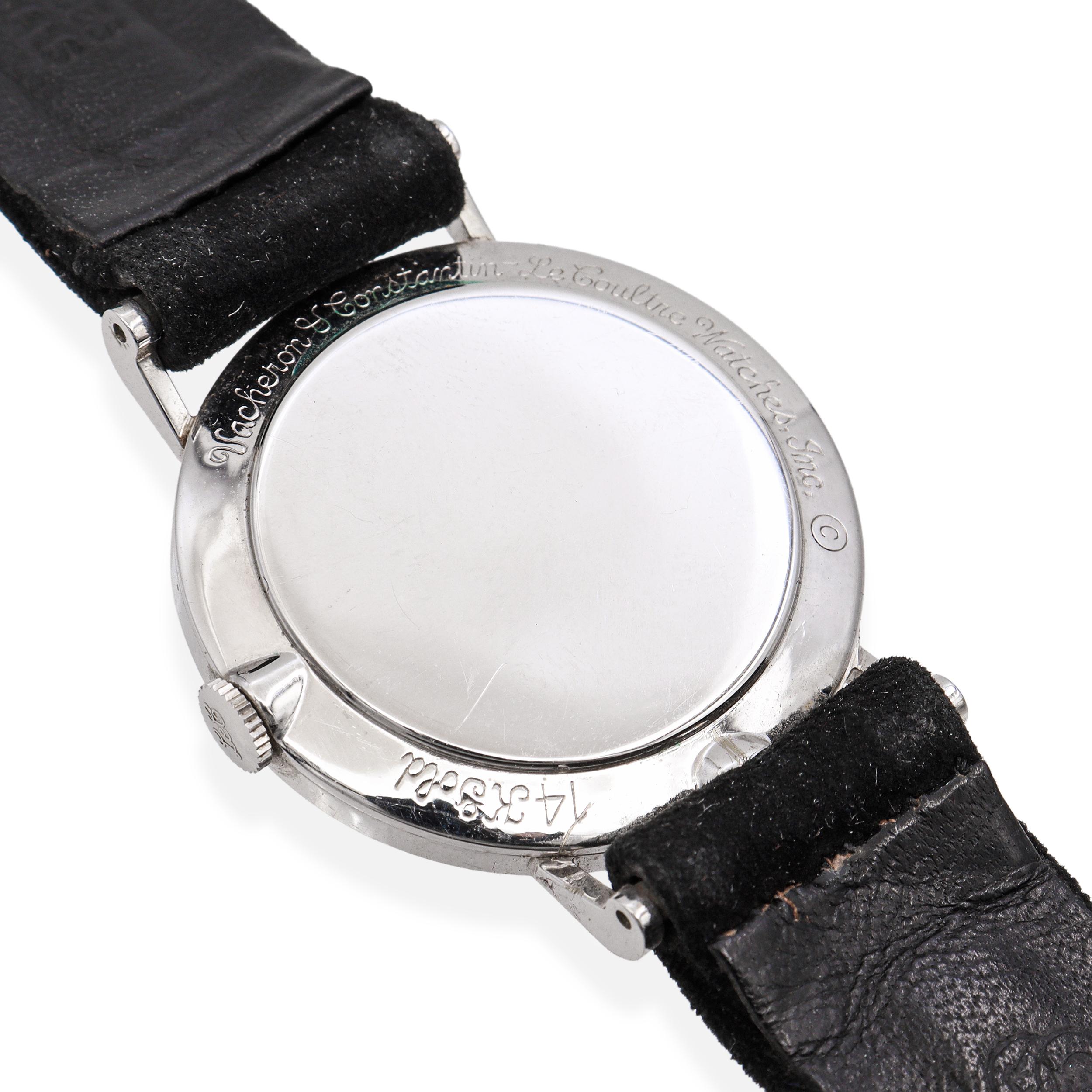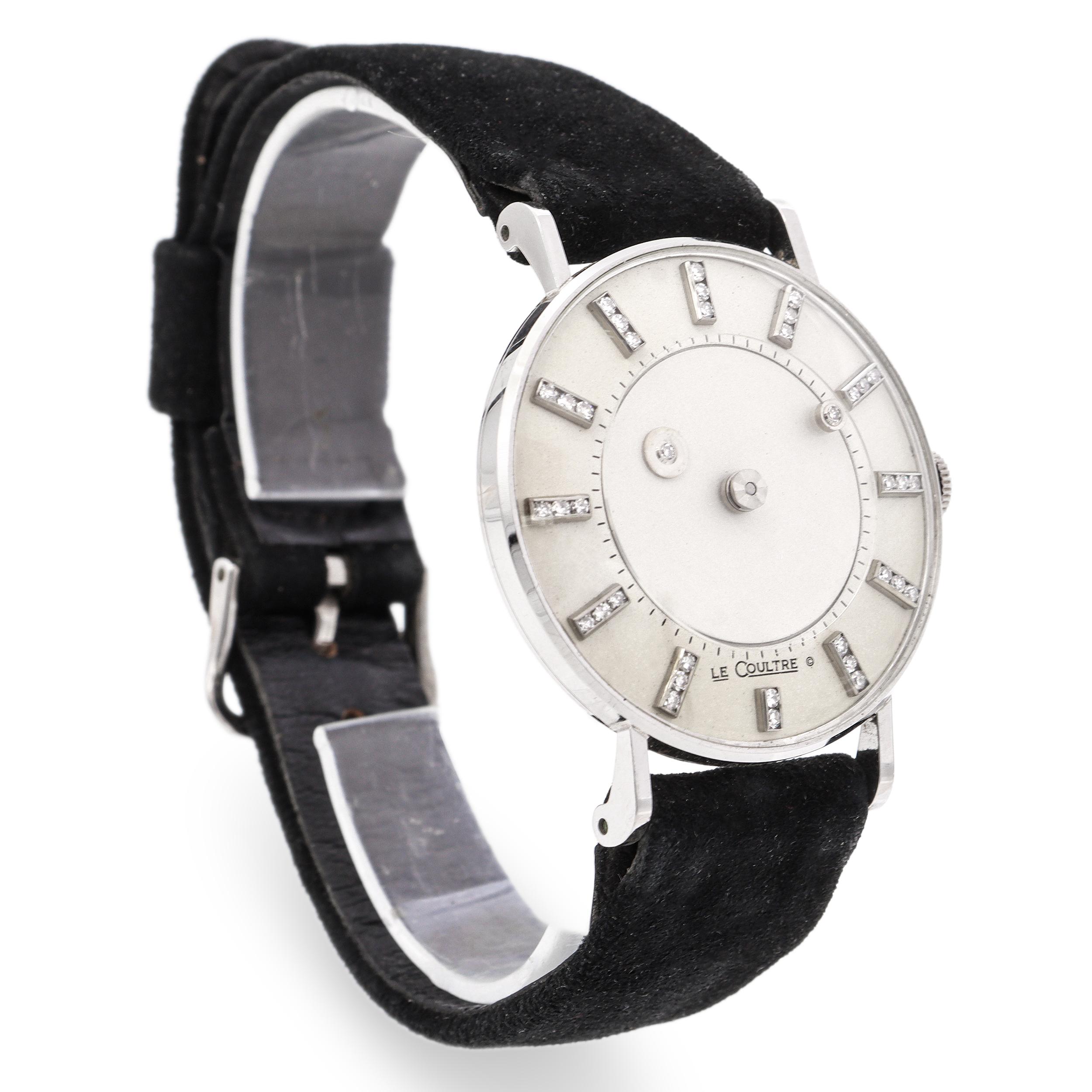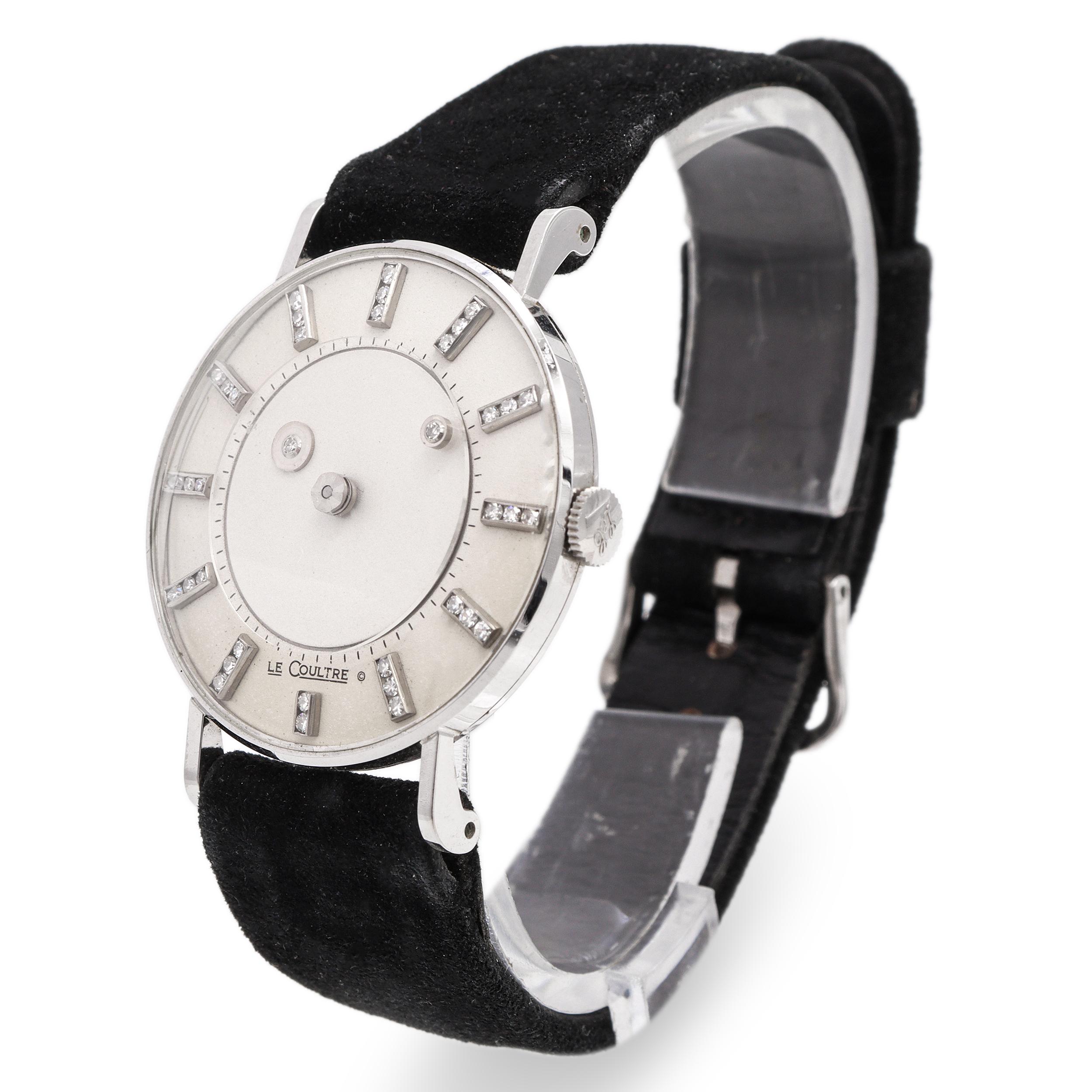 An exceptionally elegant and rare vintage timepiece produced through the historic collaboration between Vacheron Constantin and LeCoultre, showcasing the refined artistry of the mid-20th century. Crafted in solid 14K white gold, this watch features a captivating mystery dial design in which the hands appear to float, creating a clean, architectural aesthetic that highlights technical ingenuity and visual restraint. The dial is adorned with diamond-set hour markers, each precisely mounted to add subtle brilliance without overpowering the minimalist design. The silvery dial surface and polished white gold case work in harmony to reflect light softly, while the slender lugs and refined proportions give the watch a graceful, understated presence on the wrist. Signed LeCoultre on the dial, this piece reflects the era when movements by LeCoultre were supplied to Vacheron Constantin for the American market. Fitted with a black strap and accompanied by a vintage LeCoultre presentation box, this mystery dial watch is a true collector’s piece—celebrated for its technical sophistication, precious materials, and the rare dual-signature heritage that connects two of the most important names in Swiss horology.
