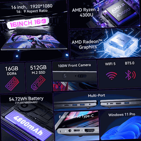 The ACEMAGIC Laptop combines powerful AMD Ryzen 3 4300U processing with a spacious 16GB DDR4 memory to deliver efficient multitasking and responsive computing. Its vibrant 16.1-inch Full HD display with a resolution of 1920 x 1200 pixels and a 16:10 aspect ratio provides clear and immersive visuals ideal for work or entertainment. Storage needs are met with a fast and reliable 512GB M.2 SATA SSD, ensuring quick access to files and applications. Running on Windows 11 Pro, this laptop offers enhanced security features and a user-friendly interface. Connectivity options include WiFi 6 for faster wireless internet speeds, Bluetooth 5.0, multiple USB ports including USB Type-C, HDMI output, and a TF card slot for versatile peripheral support. The backlit keyboard allows comfortable typing in low-light environments while the physical camera privacy switch ensures user security. Designed with a sleek graphite finish and a plastic chassis featuring a flexible 180° hinge, this laptop balances style with functionality for business or personal use.