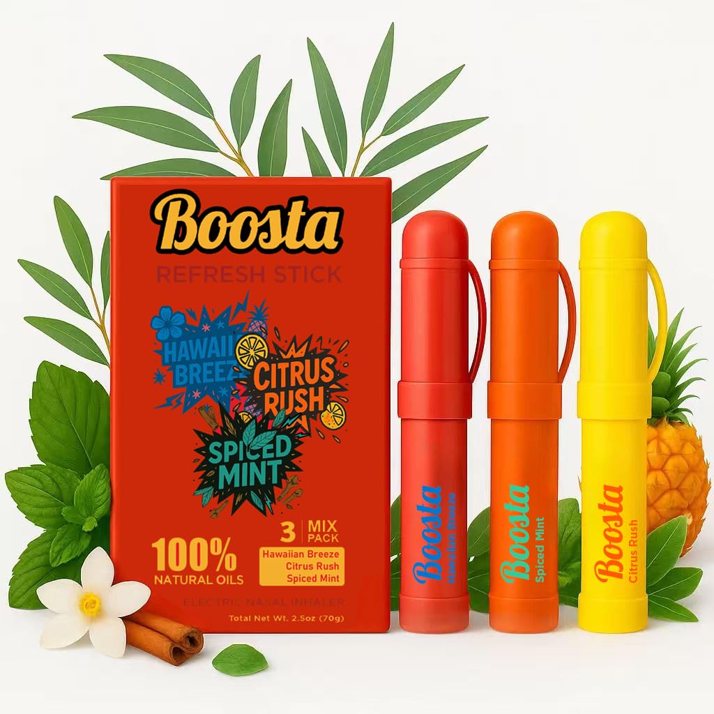 Feeling tired, lacking motivation, or struggling to stay focused during long hours of work, study, or driving? Say goodbye to sluggishness and hello to instant refresh with the Boosta Electronic Nasal Stick for Aromatherapy! Powered by 100% natural essential oils and cutting-edge micron-level essential oil vaporization technology, it delivers an instant cooling menthol burst in just 1 second—no waiting around like with traditional nasal inhalers. Unlike those other products that take over 10 seconds to kick in, our inhaler provides a fast, long-lasting refresh without any annoying or irritating sensations. Compact, convenient, and portable, this inhaler nasal stick fits perfectly in your pocket, bag, or car console, so you can take it anywhere and enjoy an instant pick-me-up whenever you need it most. Plus, with all-natural, plant-derived ingredients, you can feel confident you're getting a safe and clean experience—free from harmful chemicals and additives. With scents like Hawaiian Breeze ,Spiced Mint,Citrus Rush,there’s a perfect scent to match your mood and keep you energized and refreshed throughout the day. Why wait? Try the Boosta Nasal Inhaler Stick today and feel the instant cool, energizing effect that lasts! Whether you’re powering through work, study, or a long drive, it’s the perfect companion to keep your focus sharp and your energy high. Get yours now and experience the difference for yourself—your nose, mind and body will thank you!