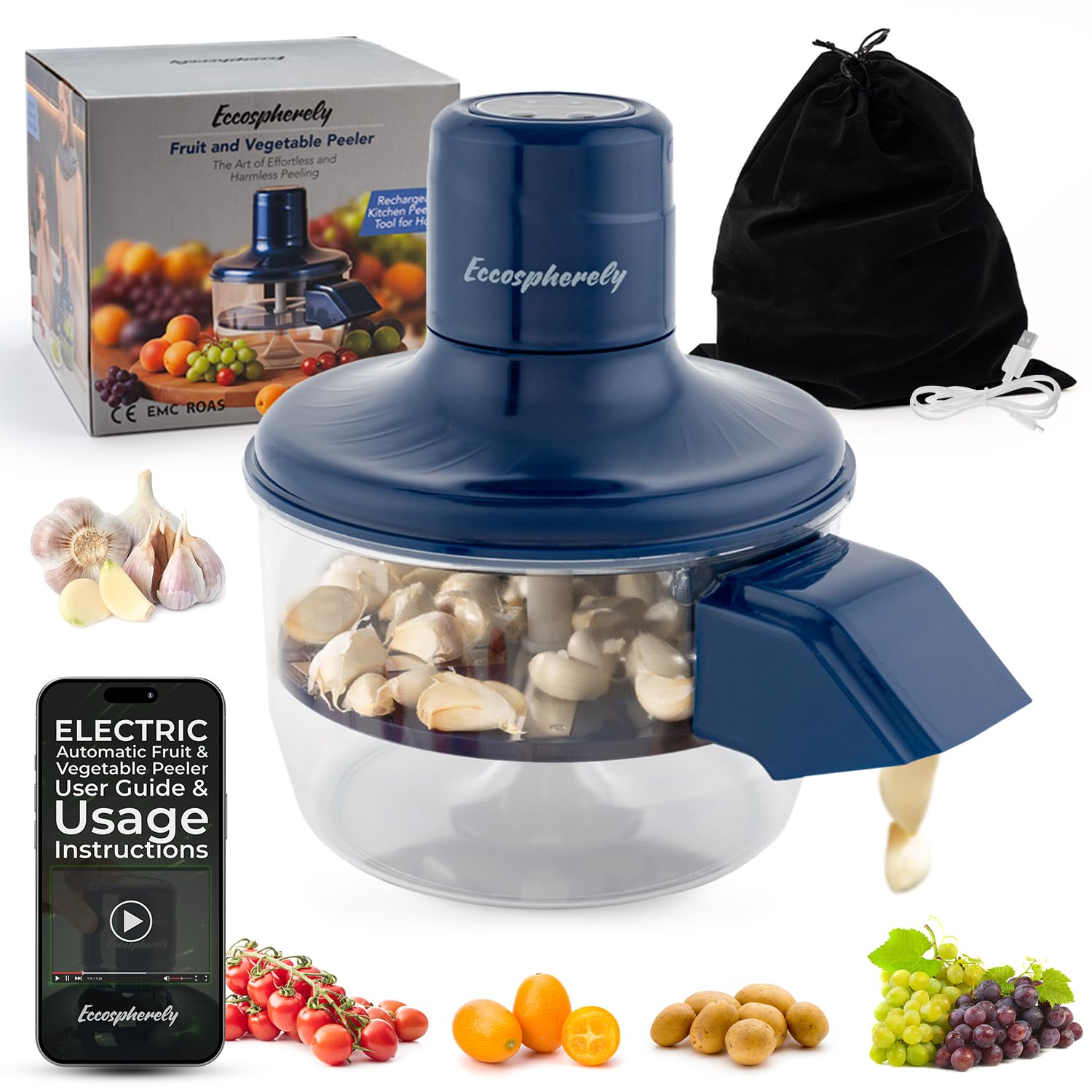 The Eccospherely Automatic Electric Peeler Machine is an efficient solution for fast and hands-free peeling. Designed for modern homes, this cordless electric peeler machine simplifies food prep by removing skins from garlic, grapes, and cherry tomatoes in as little as 20 seconds. Whether you're preparing daily meals or bulk cooking, this automatic peeler delivers consistent results without squeezing, crushing, or creating sticky messes. Unlike a traditional garlic peeler or manual fruit peeler, this advanced electric peeling machine uses a gentle internal rolling system. It loosen skins evenly while protecting delicate ingredients. It functions as a reliable garlic peeler machine. A compact grape peeler machine and a small fruit peeler machine make it a versatile addition to any kitchen. Powered by a built-in 1300mAh rechargeable battery, this automatic peeler machine offers true cordless convenience. Use it anywhere on your kitchen counter, dining table, or even during outdoor meal prep without dealing with tangled cords. Compared to bulky electric potato peelers, automatic models or blade-based tools. This blade-free design prioritises safety and ease of use for beginners, seniors, and families. Cleaning is simple and hygienic. The removable chamber rinses under running water in under 60 seconds, making it a practical electric kitchen peeler for everyday use. Finished in a sleek navy blue colour and paired with a premium storage bag. This electric fruit and vegetable peeler also makes a thoughtful gift for busy home cooks who value convenience, safety, and efficiency.