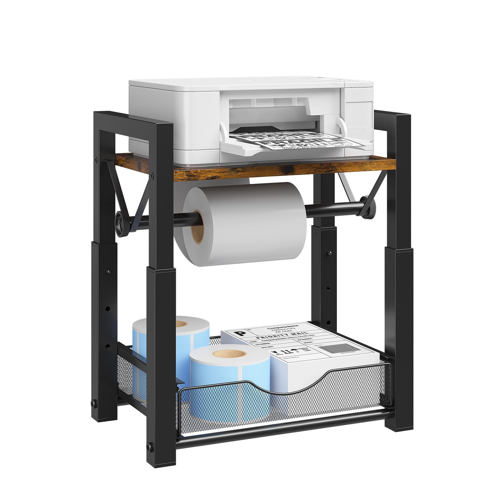 Label Holder for Rolls and Fan-Fold Labels, Modern Metal Desktop Thermal Label Printer Holder with Basket Drawer, Shipping Label Organizer, Sticker Roll Dispenser for Small Business, Office, Black