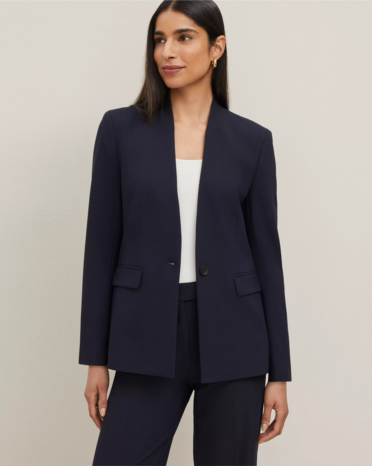 Details: Made in seasonless stretch fabric for a refined, streamlined fit, this collarless blazer brings modern minimalist appeal to office ensembles. V-neck. Single-button front. Long sleeves with button cuffs. Front flap besom pockets. Back vent. Lined. Tailored fit. Hits at hip. Machine Washable. Style: 831306