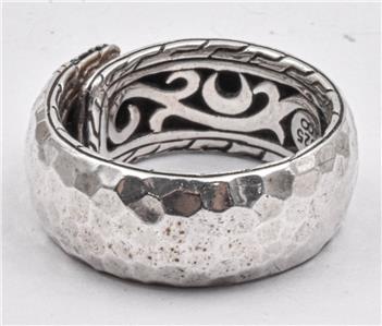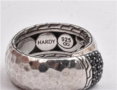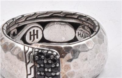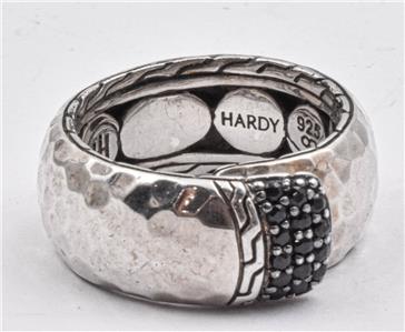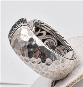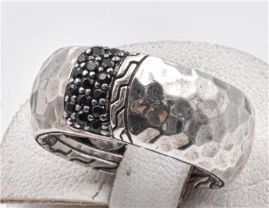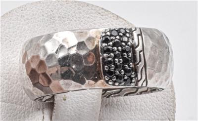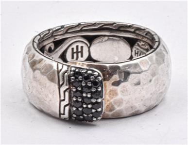 This is a signed authentic guaranteed John Hardy wide band ring, from the Palu collection, and set with black Lava Sapphires up the center, and sort of an overlap style in the front. The entire ring is hammered, one of his styles, and it is perfect, and ready to wear or to gift. Some sellers are asking upwards, of $1200 for this exact ring. No damage or repair marks.