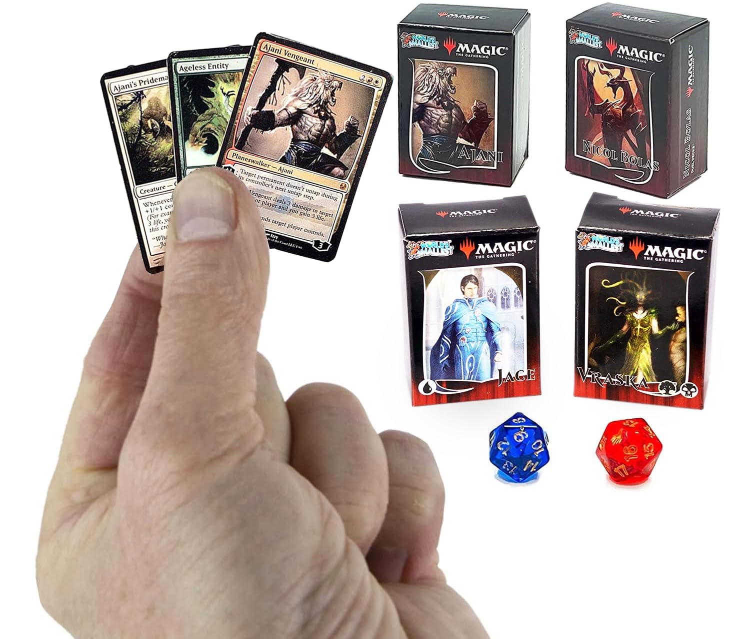 Since its release in 1993, Magic: The Gathering has captured the hearts of millions of players around the globe, appealing to beginners and experts alike. There are currently over 35,000,000 active players and the number keeps growing! 2021 was its biggest year ever! For nearly 30 years, the trading card game that started them all has been releasing new sets, telling new stories, introducing new locations to its multiverse and more. Magic: The Gathering was inducted into the 2019 National Toy Hall of Fame! Collectors of all ages will want to add this exclusive set to their collection! Come's with 4 tuck boxes, (240 total cards) and exclusive playing dice that you can't find anywhere else! This set includes Jace vs Vraska, and Ajani vs Nicol Bolus plus two miniature-playing dice!