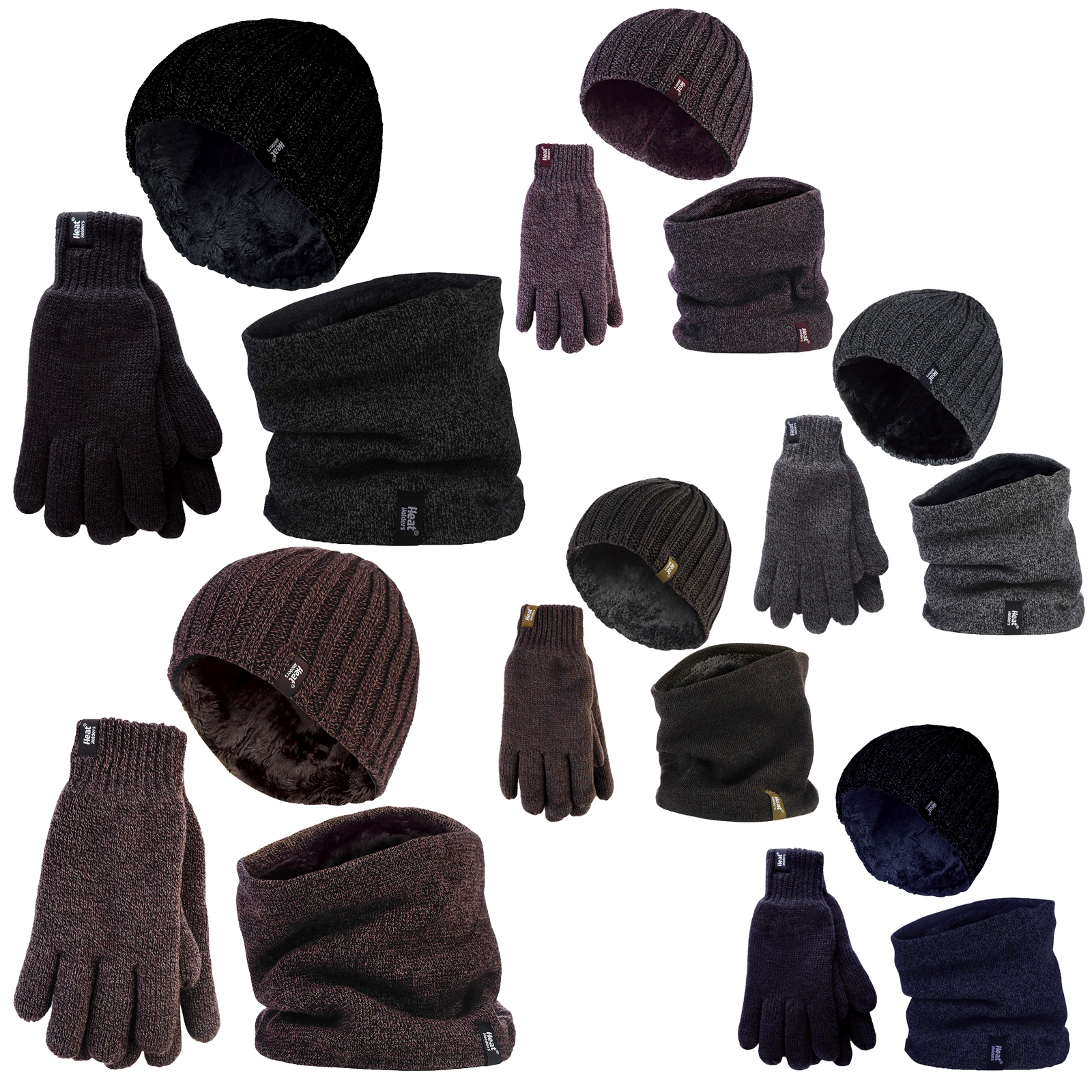 Mens Beanie Hat - Neck Warmer and Gloves Set by Heat Holders - 3 Pack Set