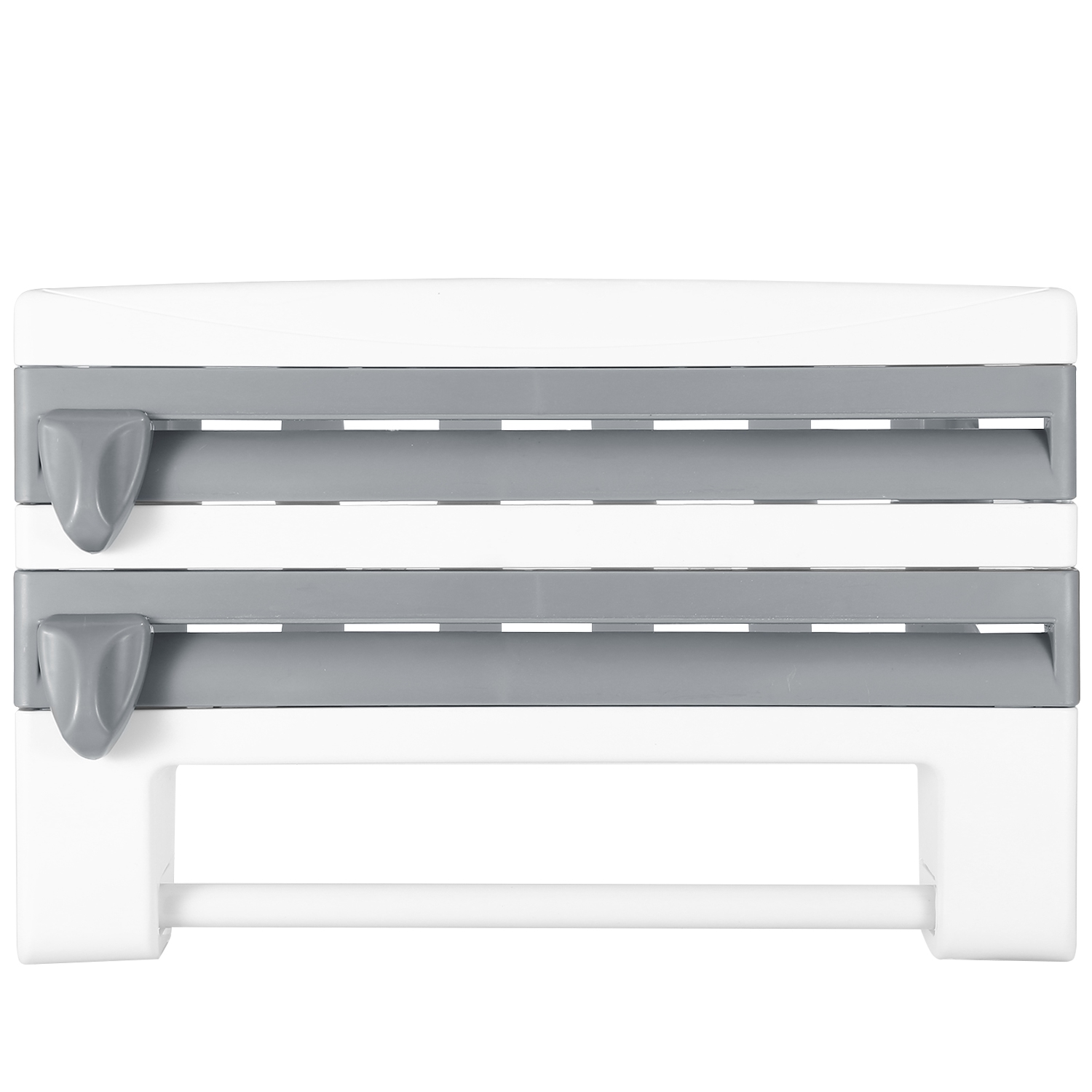 *SPACE SAVER & ERGINOMIC SHARP CUTTER:An optimal space saver for regular paper roll(Its width within 11.02inches). It serves as a plastic wrap and foil dispenser with ergonomic sharp sliding cutter. The top part gives you an ideal spice rack.