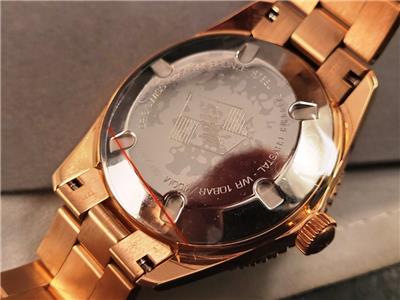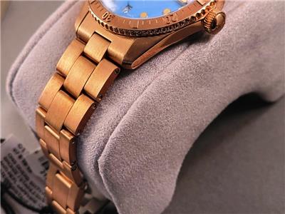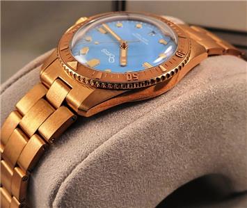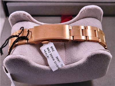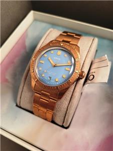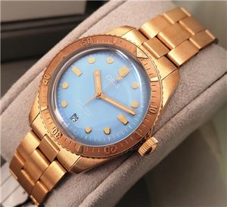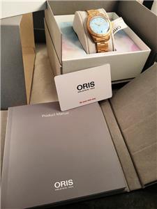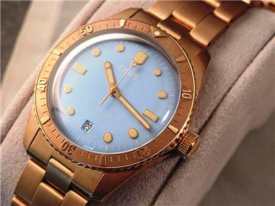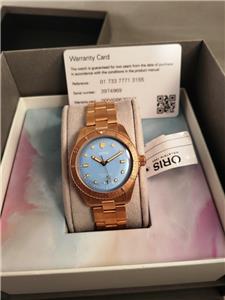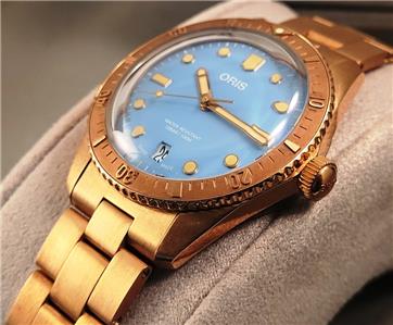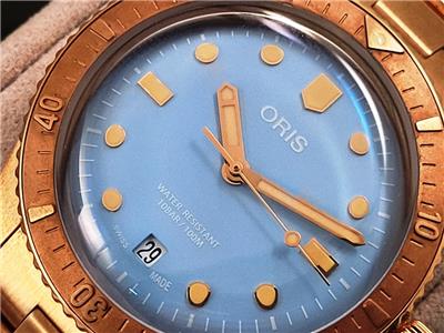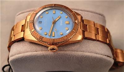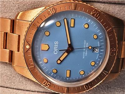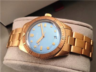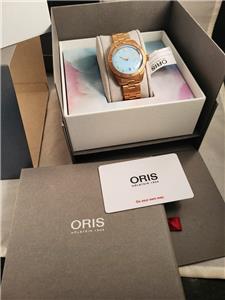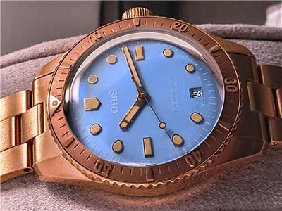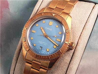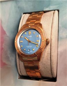New with box, books, warranty card, stickers and tags Unisex Oris 38mm Bright Bronze Diver's Sixty-Five Automatic model 01 733 7771 4058 3155. This watch one of several I am listing on Ebay was recently purchased from the inventory of a closed Oris jewelry store. Nice 38mm model with Bright Bronze case and Cotton Candy Blue dial with Bronze bracelet. The watch is new with all tags, boxes(inner outer and sleeve). The jeweler sold Rolex, Cartier, Patek Philippe etc.and I purchased these in a package with all the Rolex, Cartier Tools and parts. Selling these Oris watches under dealer cost. You will not find a better deal on new Oris watches on Ebay. This is the fourth of six Oris watches that I will list on Ebay. The photos are of the actual watch, nice color and finish!