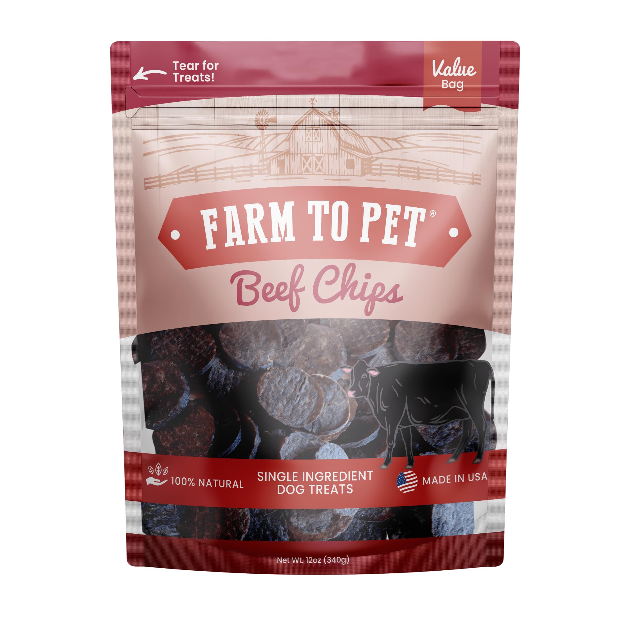 Farm To Pet Beef Chips deliver premium nutrition with just one ingredient: 100% human-grade beef sourced from American family farms. Made entirely in the USA with no fillers, by-products, preservatives, or unpronounceable additives, these lean treats provide the pure beef flavor dogs instinctively crave. Ideal for sensitive stomachs and picky eaters, our single-ingredient formula ensures easy digestion while delivering maximum flavor and nutrients. The superior absorption rate means more nutritional value per treat compared to conventional options. Like beef liver, lung, and heart, our beef round cut is packed with iron, essential vitamins, minerals, and high-quality protein. Unlike tough beef jerky, these crunchy chips break easily into smaller pieces – ideal for training sessions. High in protein yet low in calories, they're the perfect motivational reward for teaching puppies new commands or reinforcing good behavior in adult dogs without overfeeding concerns. From tiny terriers to massive mastiffs, energetic puppies to distinguished seniors, dogs of all breeds and sizes can't resist the irresistible crunch and rich beef flavor. Thousands of satisfied four-legged customers agree! Our signature dehydration process transforms premium beef into perfectly textured treats. Supporting American farmers while delivering uncompromising quality your best friend deserves.