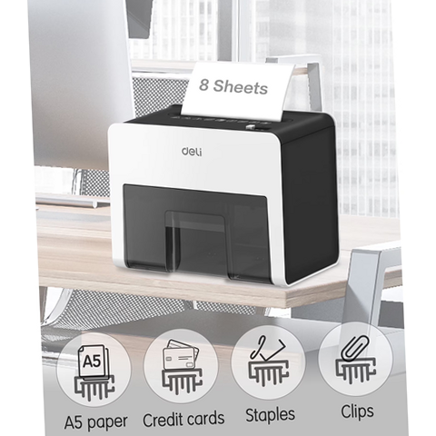 Shredding Capacity: Shreds up to 8 sheets of A5 paper, credit cards, staples, and paper clips at once.