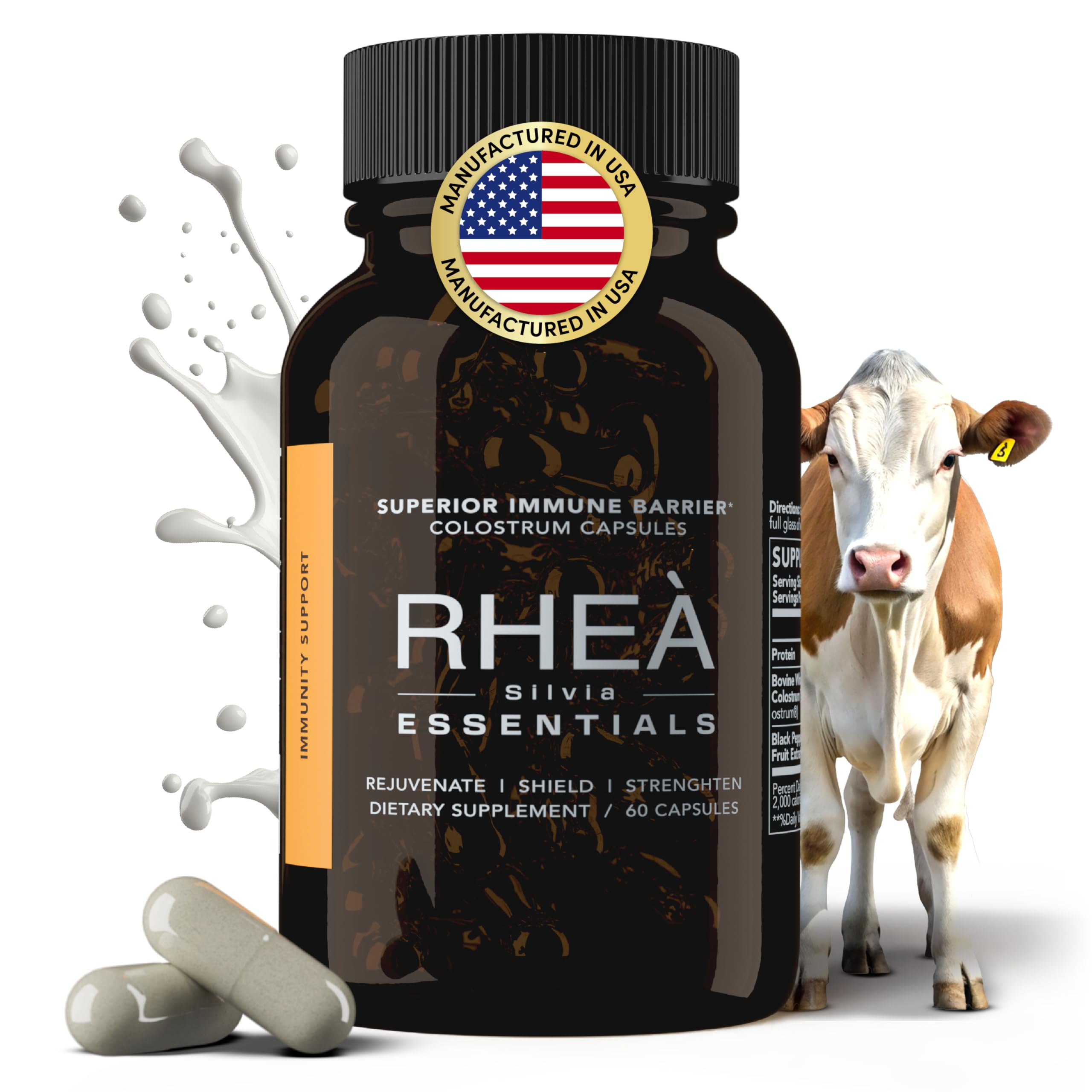 Introducing RHEA Essentials Colostrum, your premium supplement derived from the finest colostrum sourced from grass-fed cows. Our colostrum capsules deliver a potent blend of essential nutrients to support overall well-being and bodily functions. RHEA Essentials Colostrum for women is a top-quality bovine colostrum supplement for women designed to help to improve your immune system and enhance your body's natural defense mechanisms. Packed with immunoglobulins, lactoferrin, and other vital growth factors, our colostrum capsules help you stay healthy. Our colostrum capsules are easy to incorporate into your daily routine. Simply take 2 capsules of RHEA Essentials Colostrum daily with water, preferably on an empty stomach or as directed by your healthcare professional. This simple yet effective regimen ensures you receive the full benefits of our potent colostrum supplement, supporting your health and vitality day after day. What sets RHEA Essentials Colostrum pills apart is our commitment to quality and purity. Our colostrum is non-GMO, gluten-free, and contains no artificial additives or preservatives. We take pride in offering a supplement that you can trust. Our bovine colostrum is sourced from grass-fed cows raised on organic farms, ensuring that you receive the highest quality colostrum available. This dedication to excellence guarantees a product that is both effective and ethically produced. Whether you are looking to boost your immune system, improve your digestive health, or simply enhance your overall wellness, RHEA Essentials Colostrum is the perfect choice. Our carefully formulated colostrum capsules deliver all the benefits of natural colostrum in a convenient, easy-to-take form. Embrace the power of bovine colostrum for humans and experience the difference it can make in your health.