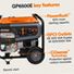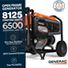 The Generac GP6500 portable gas generator offers dependable power with 8125 starting watts and 6500 running watts to support essential appliances during outages or outdoor use. Equipped with PowerRush Advanced Technology, it delivers over 40% more starting capacity than standard generators, enabling operation of motor-driven appliances and power tools with high startup demands. The integrated COsense carbon monoxide detection continuously monitors CO levels and automatically shuts down the unit if hazardous levels are detected, enhancing user safety. Powered by an industrial-grade OHV engine paired with a large-capacity steel fuel tank featuring a built-in fuel gauge, it provides up to 10.5 hours of continuous operation at half load. The heavy-duty 1.25-inch steel tube cradle frame offers superior strength and stability while covered outlets protect connections from weather and debris. Additional features include low-oil level shutdown to prevent engine damage, an hour meter for maintenance tracking, and heavy-duty never-flat wheels with a fold-down handle for easy transport across rough or uneven terrain. This generator is designed for residential use, outdoor activities, and demanding job site applications where reliable portable power is essential.