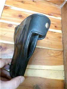 This is Hume's MODEL H901 BULWARK, BREAKFRONT HOLSTER, 2nd Generation. Made from uniform quality, top grain cowhide, it actually only a Half Break front. This lets you clear leather in half the time of a fully enclosed rig, the holster uses a V Spring design to maintain holster stiffness, and a rear trigger pocket to make a gun grab from the rear most difficult.
