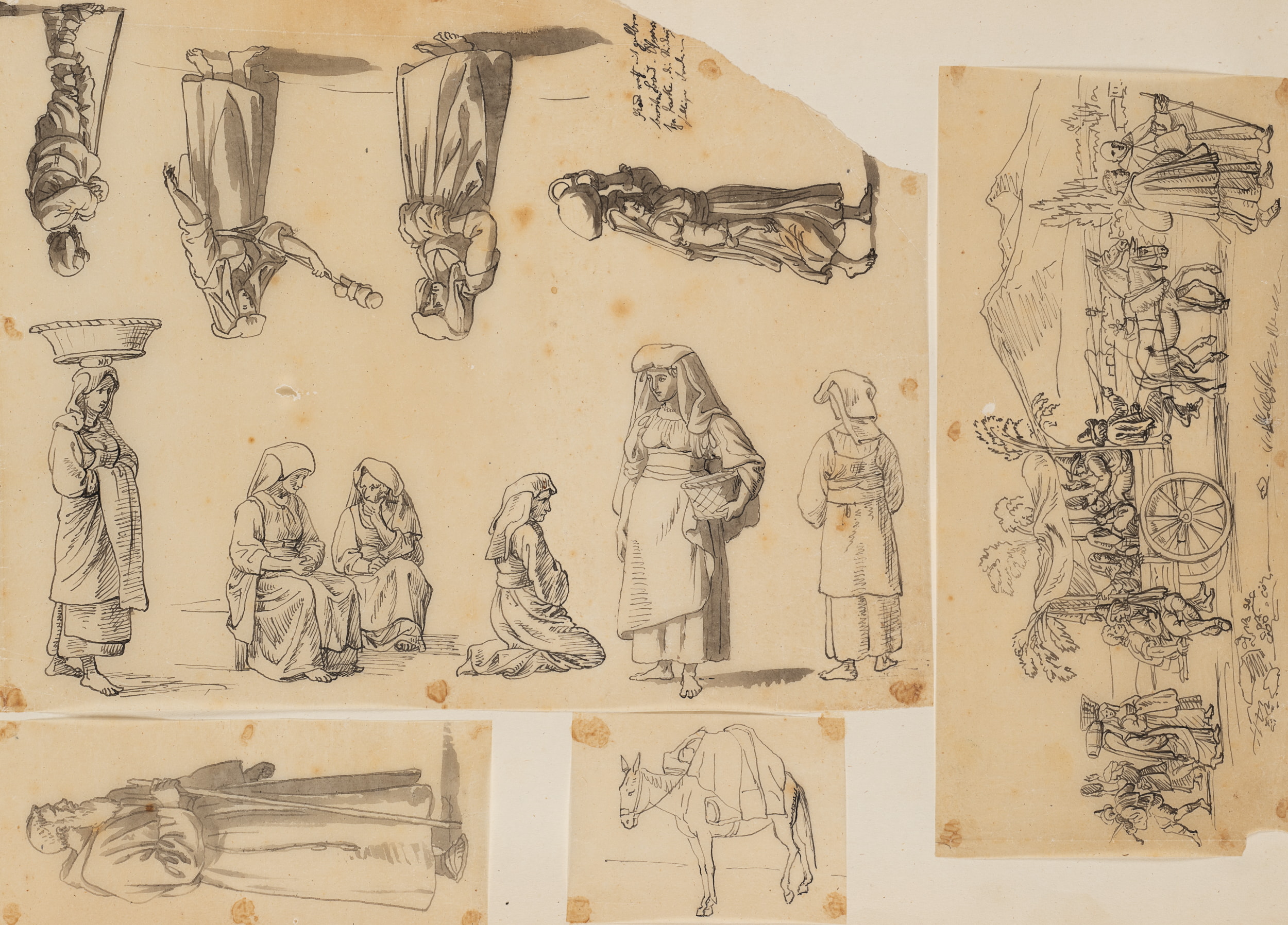 - Description: The sheet of paper contains four sketches on tracing paper showing women in Italian costume in various poses and arrangements, alongside a full-figure depiction of a monk in habit and with a long staff, as well as a depiction of a loaded donkey. The print on the right also shows an Italian landscape with travelling peasants on foot and in a carriage.