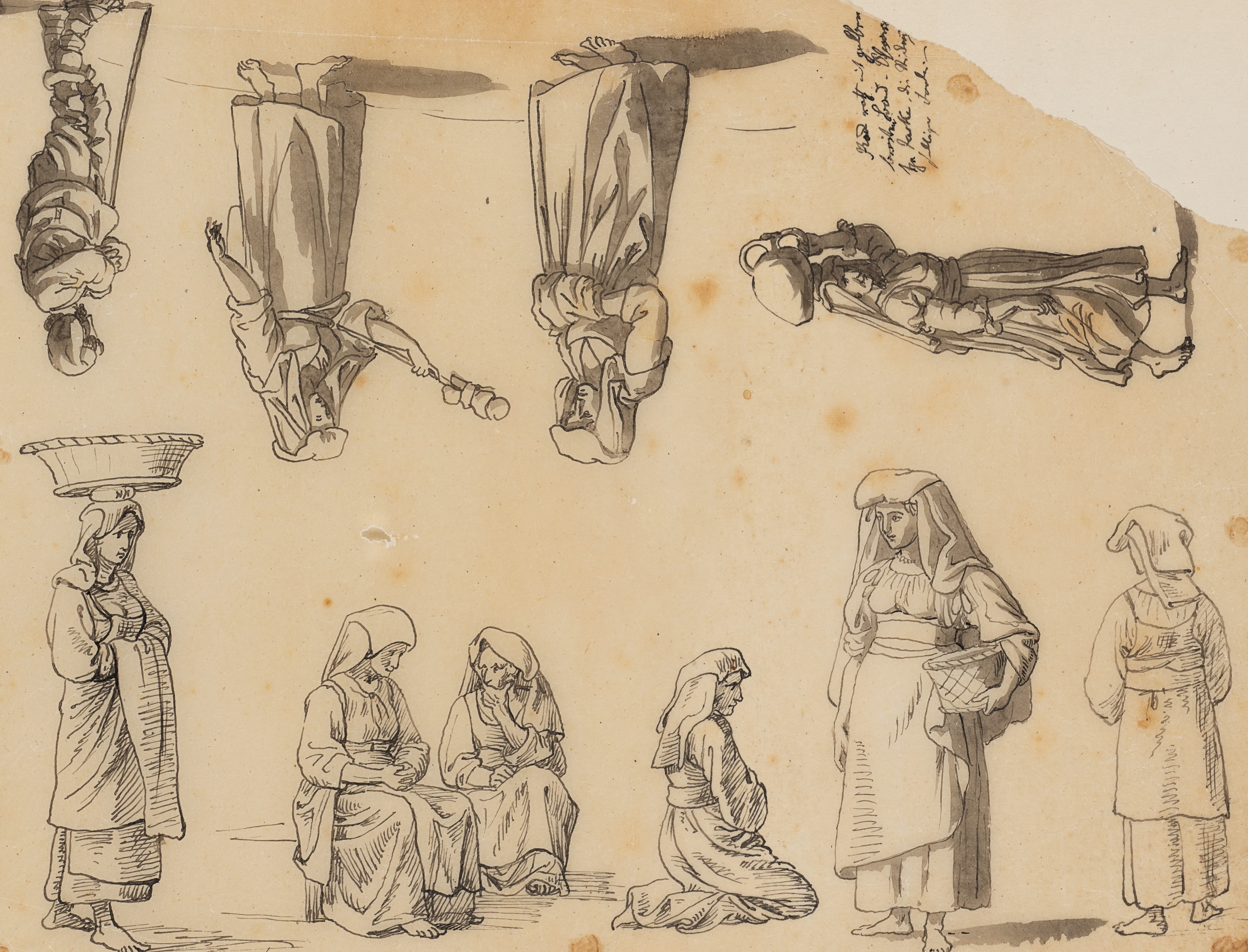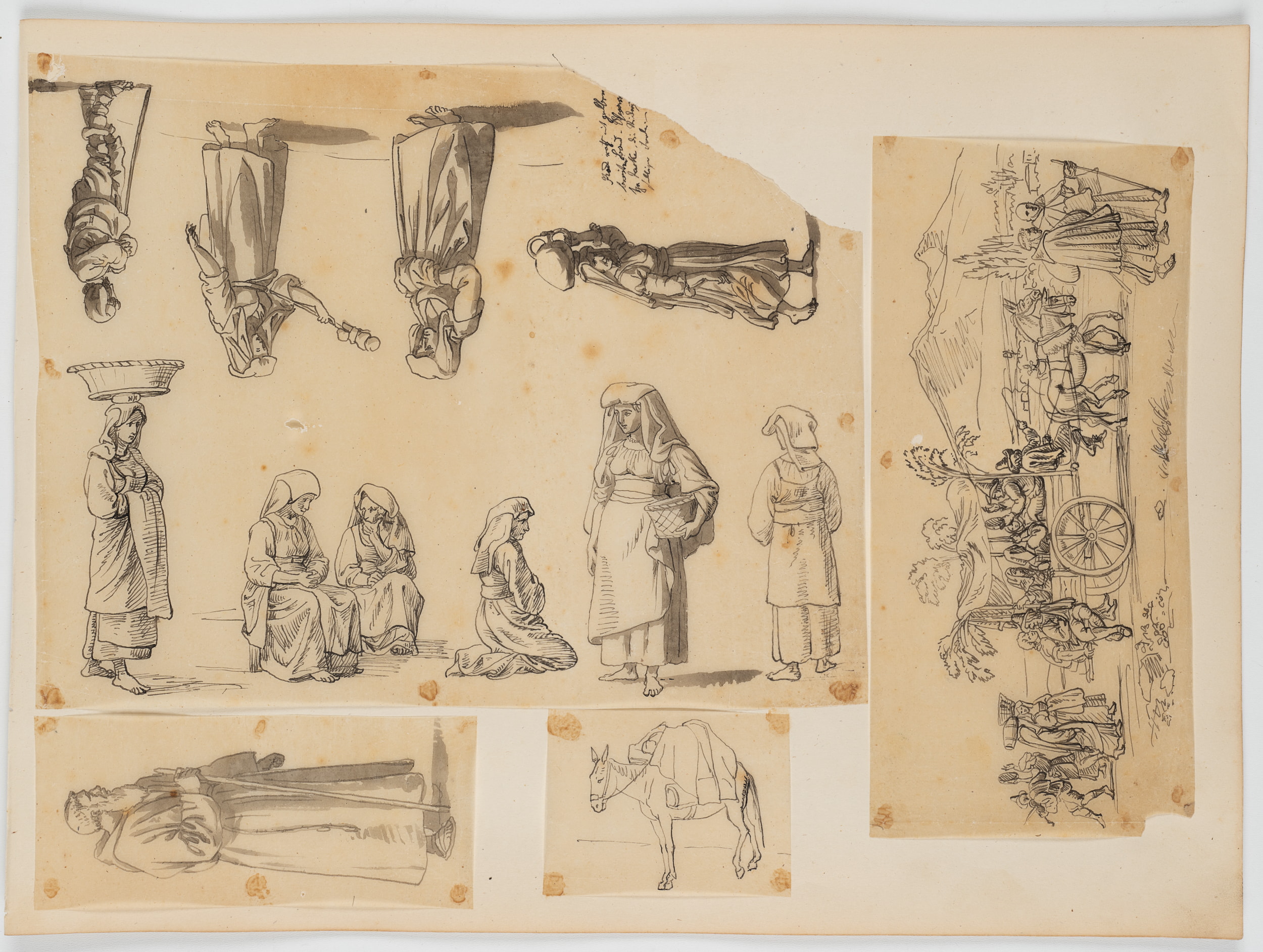 - Beschreibung: Der Papierbogen enthält vier Skizzen auf Transparentpapier, die Frauen in italienischer Tracht in verschiedenen Posen und Arrangements zeigen, daneben eine ganzfigurige Darstellung eines Mönchs in Habit und mit langem Stab sowie die Darstellung eines beladenen Esels. Außerdem zeigt die Grafik rechts eine italienische Landschaft mit reisenden Bauern zu Fuß und in einer Kutsche.
