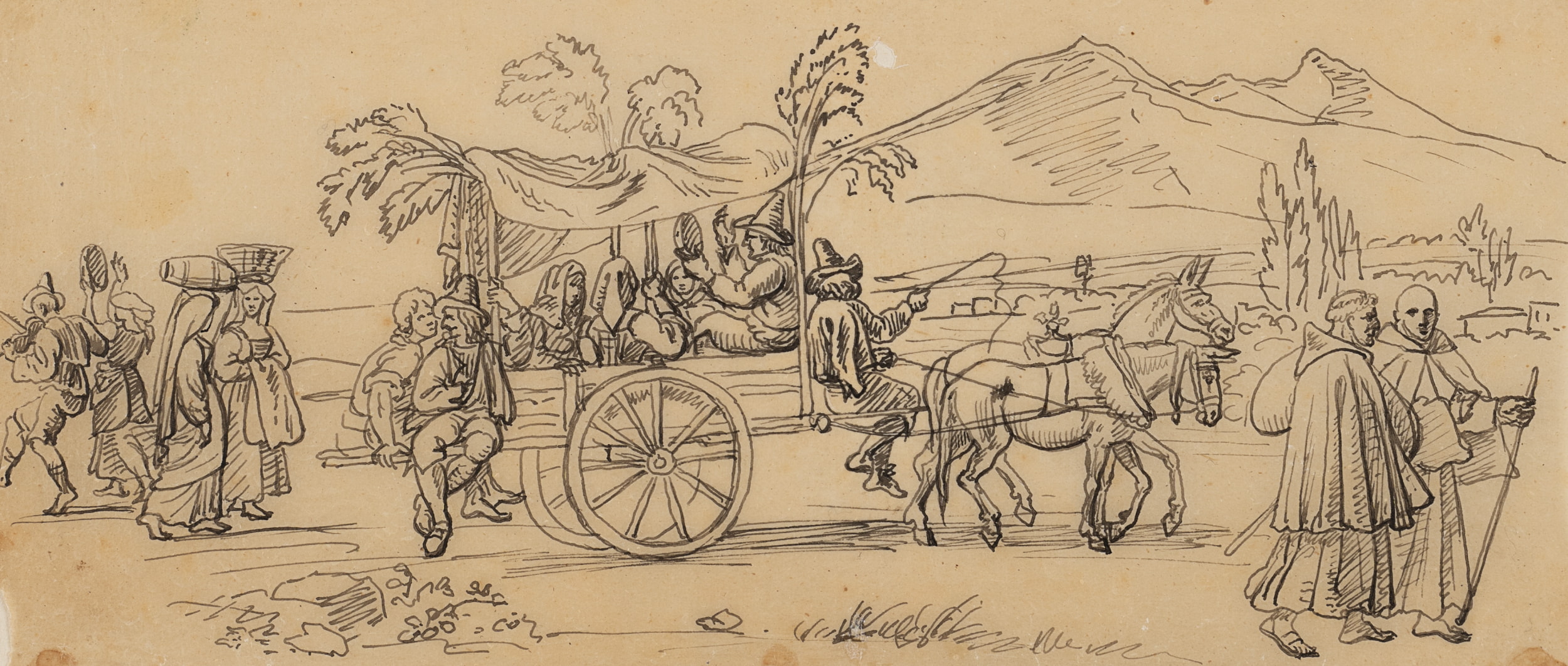 - Keywords: Sketches; studies; figures; poses; arrangements; everyday; sketches; depiction of people; clothing; costume; posture study; pack mule; monk; journey; on the road; carriage; peasants, 19th century, Historicism, Costumes, Italy,
