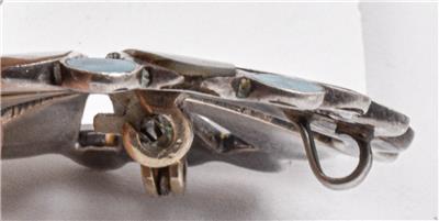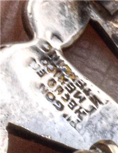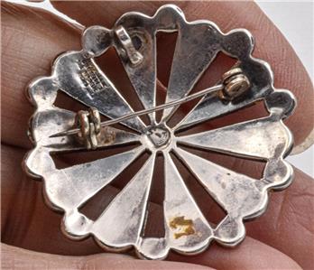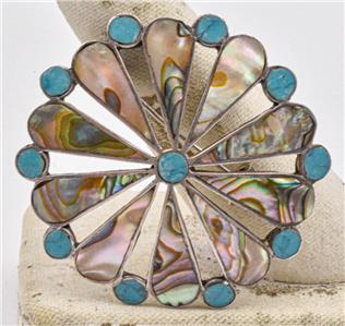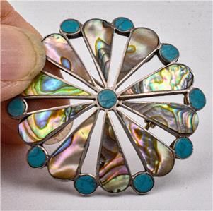 This is a guaranteed, sterling silver made in Mexico older brooch, or pendant, with a name, that looks like Tugon, but not sure exactly what it says. This is set with Abalone shell, and aqua color stones, the color of Gurquoise, but maybe are Howlite. It measures 1.73" in diameter and is guaranteed original, and not a reprodution.