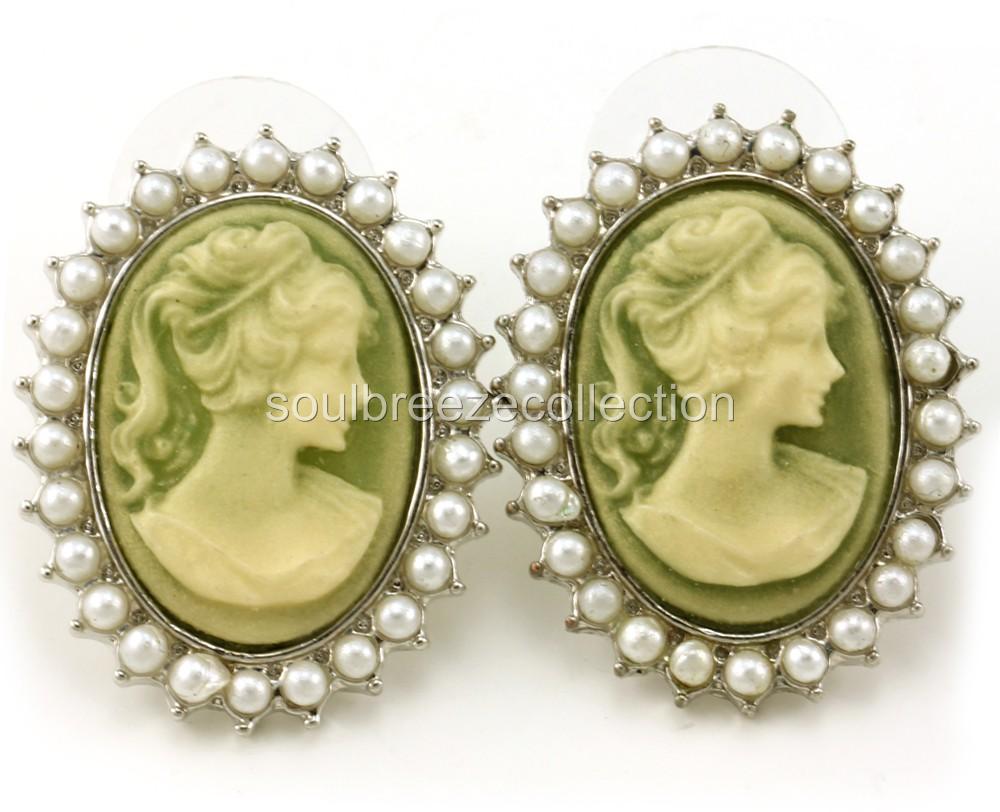 Title: Light Olive Green Cameo Stud Post Pierced Earrings White Faux Pearl Silver Tone