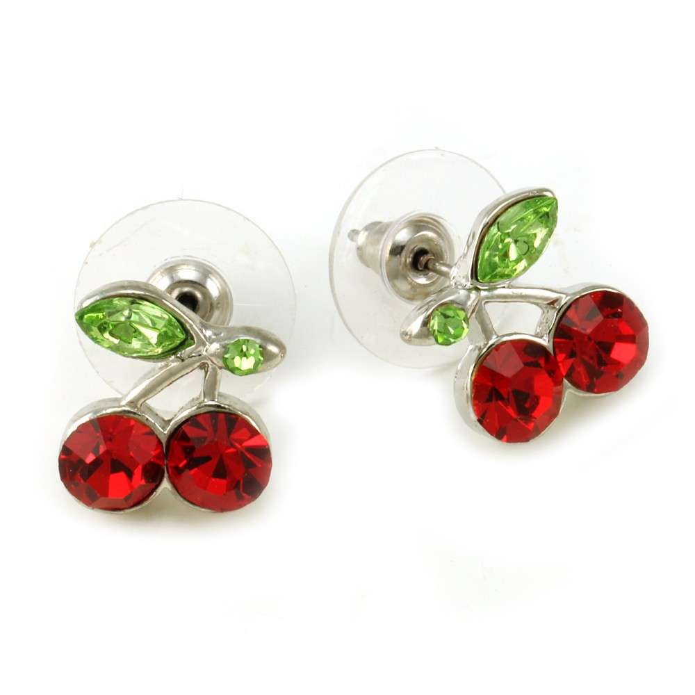 Title: Green Leaf Red Fruit Cherry Stud Post Earring High Polish Silver Tone Jewelry g1