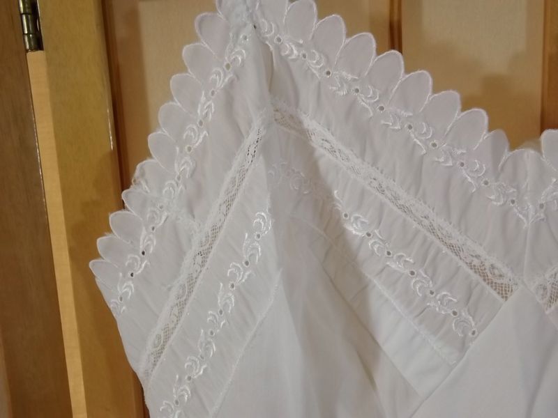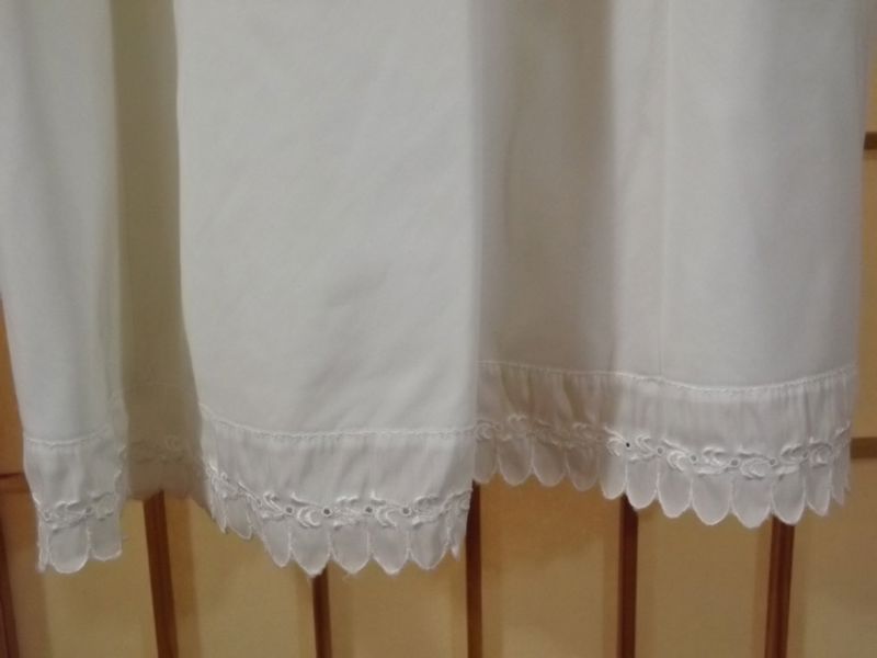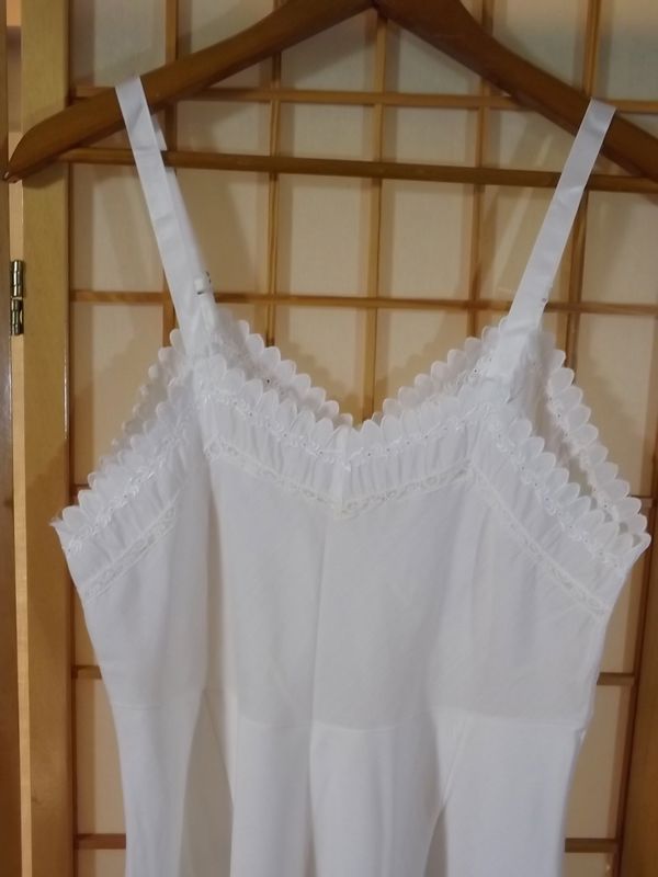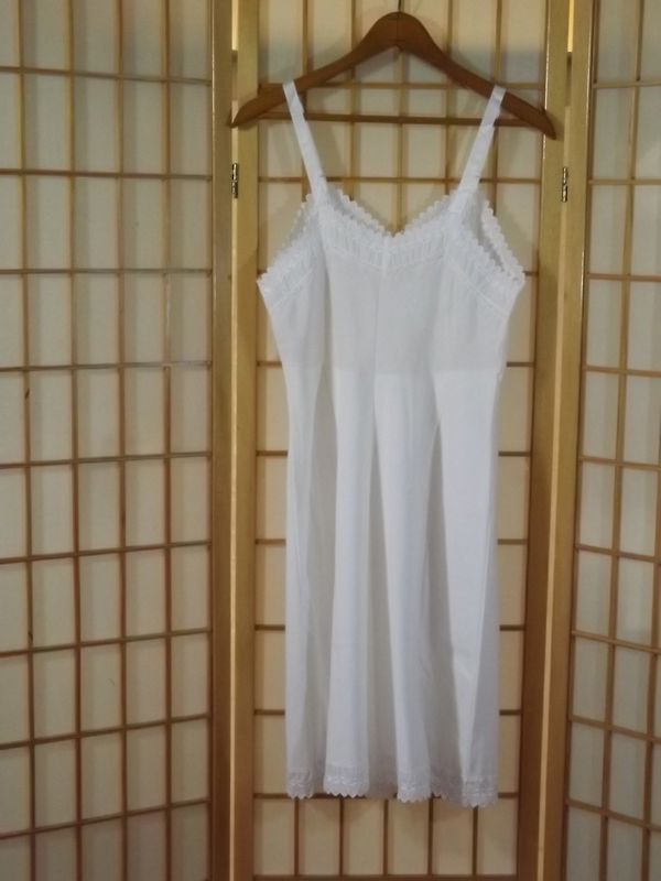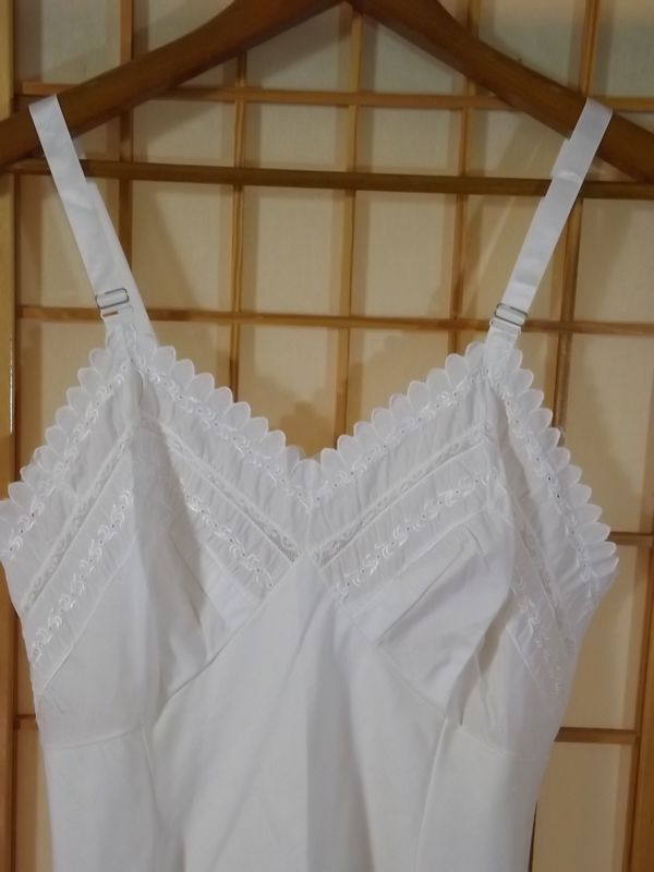 ITEM: Vintage 1950s women's full slip. Quality made in the United States by Wonder Maid. Adorable Baby Doll style!! White linen type fabric is a blend of 25% cotton, 28% nylon, and 47% Dacron Polyester. Raised bodice with contoured breast cups that are darted for a curvy fit. Breast cups have a scalloped trim with rows of embroidered eyelet lace and dainty floral lace. Hem is also trimmed with matching scallop embroidered eyelet lace. Satin shoulder straps are adjustable with metal slides.