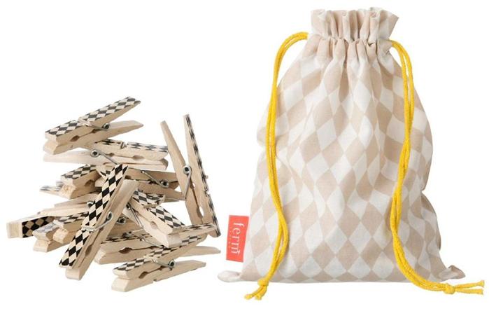 Laundry has never been so stylish! These clothes pins from Ferm Living come in their own boldly patterned bag with the same pattern that is silk screened on the set of 20 clothes pins in black. The pins are also perfect for use as clips to hang postcards and small decorative items! Also great for your little DIY creations to do with children. They make a fun and unique house warming gift and are sure to add a little style where ever you decide to use them.