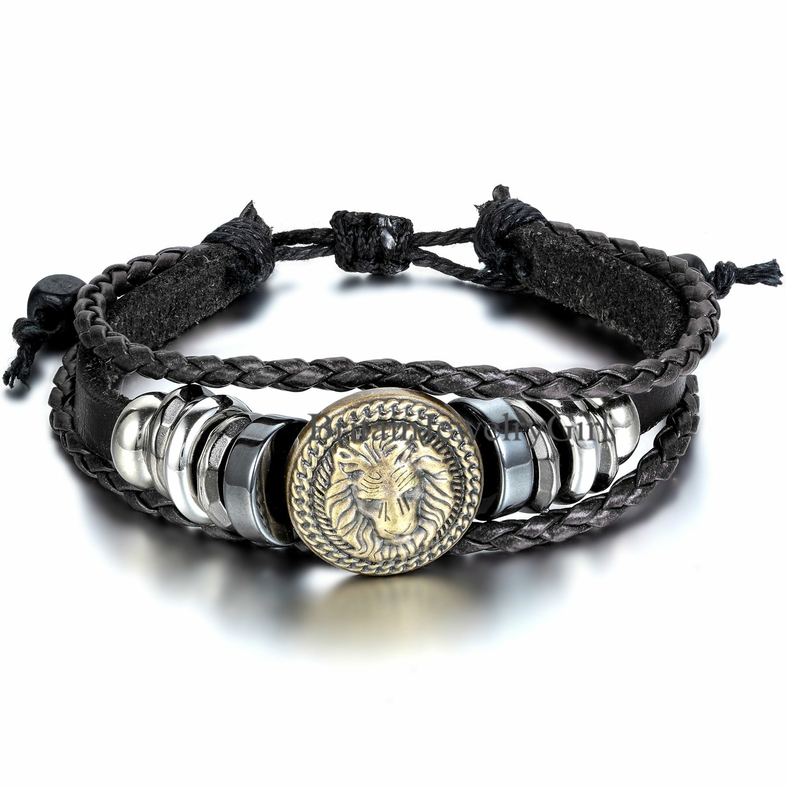 • Men Women Multilayer Lion Head Braided Leather Cuff Bangle Bracelet Wristband