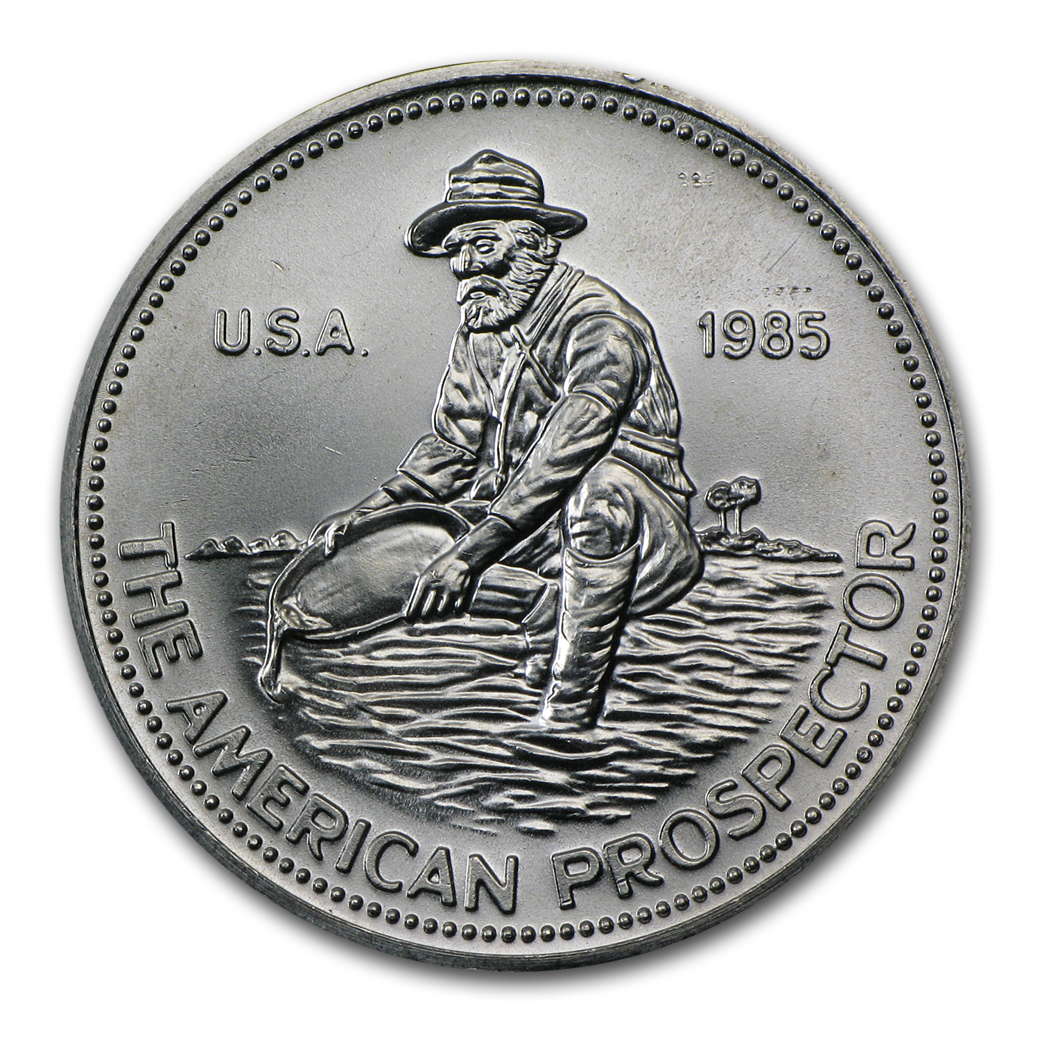 - Obverse: Depicts a prospector panning for Gold, the words U.S.A., the year of issue and The American Prospector.