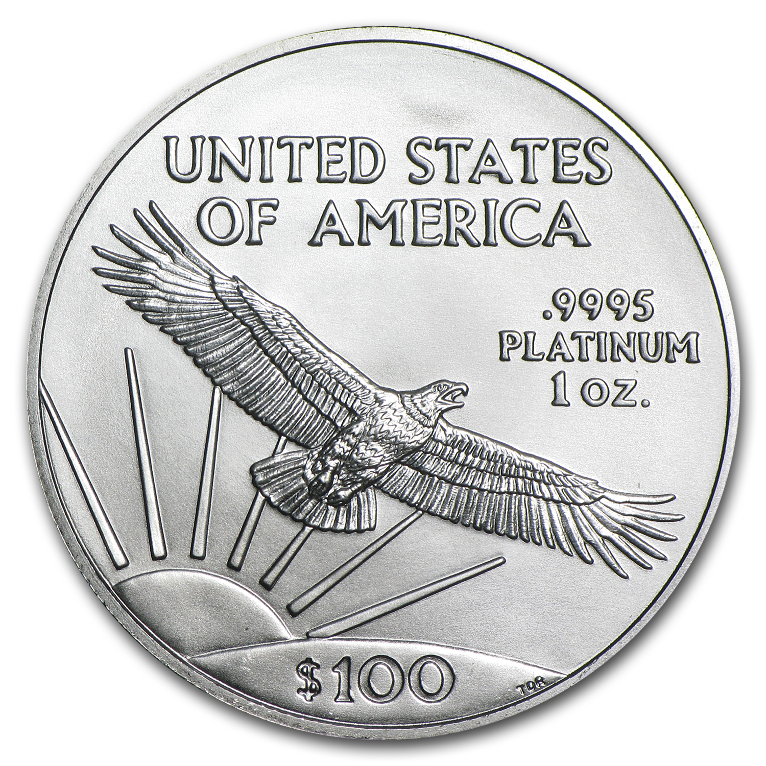 - Reverse: An American eagle with outstretched wings soaring in front of a sunrise with United States of America above. The weight, purity and $100 face value are also shown.