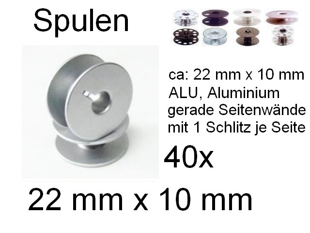 Es handelt sich hier um Spulen aus Aluminium. Matte und glatte Oberfläche. Sie haben geschlossene Seitenwände (vollwandig). Mit Schlitz an jeder Seite für den Spulenaufwickler. Die kleine Blechfeder des Spulengarnaufrollers kann in diesen Schlitz greifen und die Spule sicher mitdrehen.