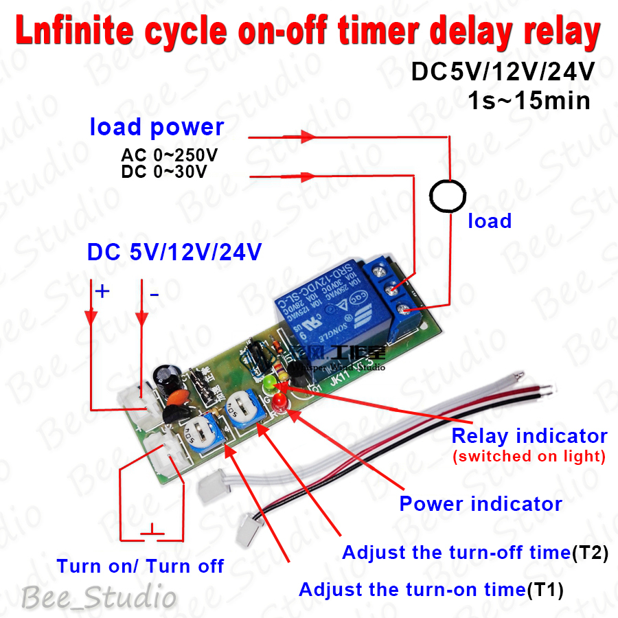 1. The module Power-on, When triggered the relay is switched on, (T1) timer delay off. (T2) timer delay on. Such cycle. T1 and T2 are set by two adjustable resistors, respectively. 2. When triggered on the delay process, again triggered, it will immediately interrupt the delay.