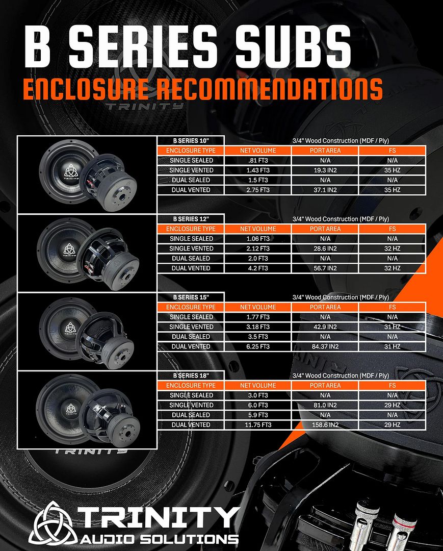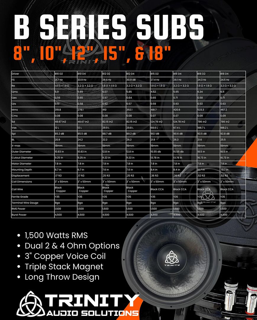 B Series 10" 1500w RMS D4The Trinity Audio Solutions B series subwoofers are crafted to provide an exceptional bass experience for both novice and seasoned bass enthusiasts. Drawing on the knowledge and expertise gained from the M and H series, the B series subwoofers are designed to deliver substantial bass performance in a more versatile and accessible package. This series is ideal for those who seek high-quality sound but may not have the resources for extensive electrical modifications or high-end amplifiers. The B series features a robust cast basket and maintains Trinity Audio Solutions' signature all-black sleek design, ensuring both durability and aesthetic appeal. Each subwoofer in the B series is equipped with a 3" high-temperature dual voice coil, which provides the capability to handle 1500 watts RMS. This power rating ensures that the subwoofers can deliver deep, impactful bass while maintaining clarity and precision. A notable aspect of the B series is its high excursion capabilities, facilitated by 10" spiders on the 12" and larger models, and 8.6" spiders on the 10" models. This design allows for greater movement of the cone, resulting in more dynamic and powerful bass output. Additionally, the double-stacked motor design, enhanced with Finite Element Analysis (FEA) cooling features, ensures that the subwoofers remain cool and efficient even during prolonged use. The B series subwoofers are equipped with advanced cooling mechanisms to prevent overheating, ensuring reliable performance under various conditions. Available in 10", 12", 15", and 18" sizes, the B series subwoofers offer a range of options to suit different installation requirements and preferences. They are versatile enough to be used in various enclosure types, including ported, 4th order, and 6th order bandpass boxes. Trinity Audio Solutions recommends these configurations to maximize the subwoofers' performance, delivering optimal bass response and sound quality. The development of the B series was driven by extensive testing, FEA modeling, and multiple iterations, ensuring that each subwoofer meets Trinity Audio Solutions' high standards of quality and performance. The rigorous testing process includes various stress tests to ensure durability and reliability. This meticulous approach guarantees that customers receive a product that not only meets but often exceeds their expectations. Customer satisfaction is a top priority for Trinity Audio Solutions, and the B series subwoofers have already garnered positive feedback from numerous users. Although designed as a more accessible option, the B series does not compromise on the quality and performance that Trinity Audio Solutions is known for. The subwoofers are built to withstand extreme conditions, with some users reporting successful runs at over 174 dB with no damage to the subwoofers. To further support customers, Trinity Audio Solutions offers recone kits for all their subwoofers, including the B series, allowing users to maintain their subwoofers' performance over time. Additionally, a 1-year manufacturer warranty provides peace of mind, ensuring that any issues can be promptly addressed. In conclusion, the Trinity Audio Solutions B series subwoofers represent a perfect blend of performance, versatility, and value. Designed for the up-and-coming basshead, these subwoofers deliver powerful and dynamic bass without requiring extensive modifications or high-end equipment. With their robust design, advanced features, and rigorous testing, the B series subwoofers are set to become a favorite among bass enthusiasts seeking high-quality sound at an accessible price.
