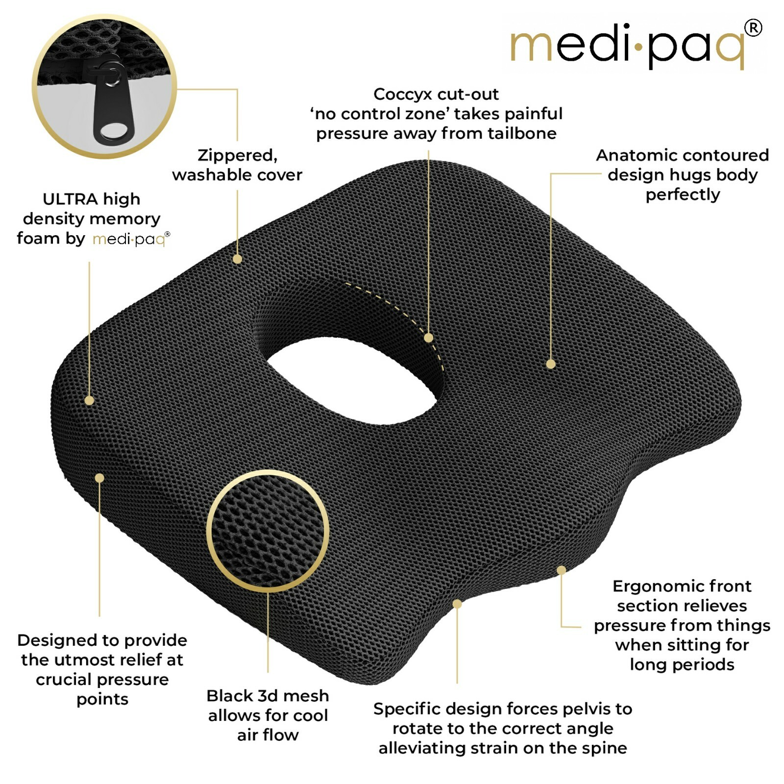 EXPERTLY DESIGNED - We use high density foam in this tailbone cushion to ensure a rigid and sturdy base - it will not flatten like a memory foam cushion will over time which is so key in dealing with coccyx / tailbone pain. Our ergonomic design is recommended by orthopaedic surgeons and medical specialists for treatment of pain by reducing pressure in the key areas. It's the perfect combination of a traditional seat cushion with the benefits of a ring / donut cushion!