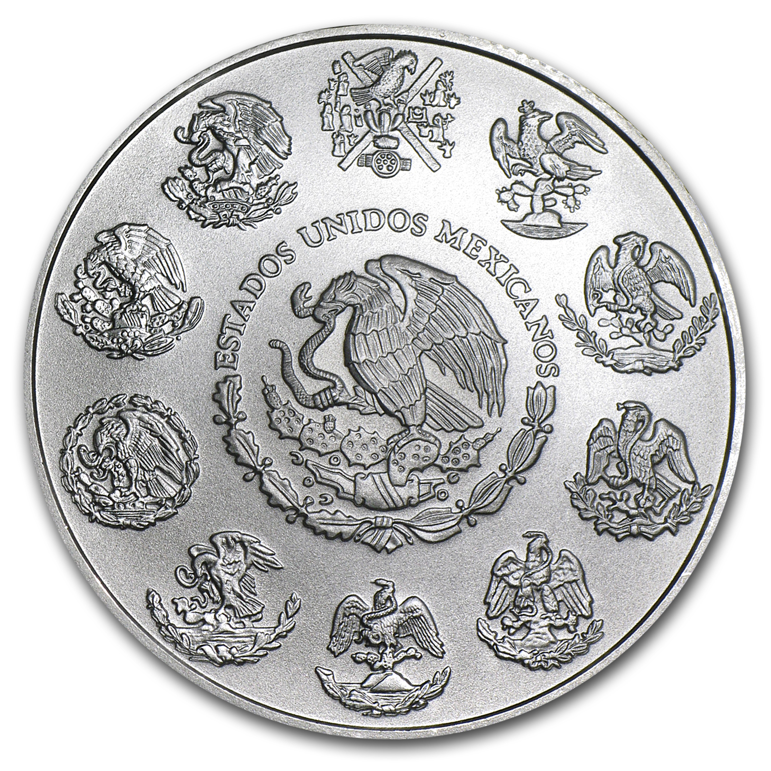 - Obverse: Mexican national seal with an eagle sitting atop a cactus surrounded by symbols representing Mexicos 10 provinces.