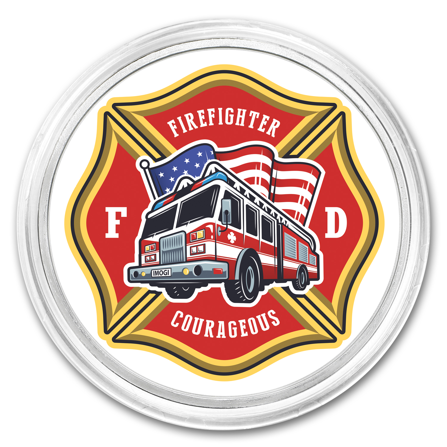- Obverse: Features a firefighter seal with the image of a fire truck and the words, Firefighter, FD and Courageous.
