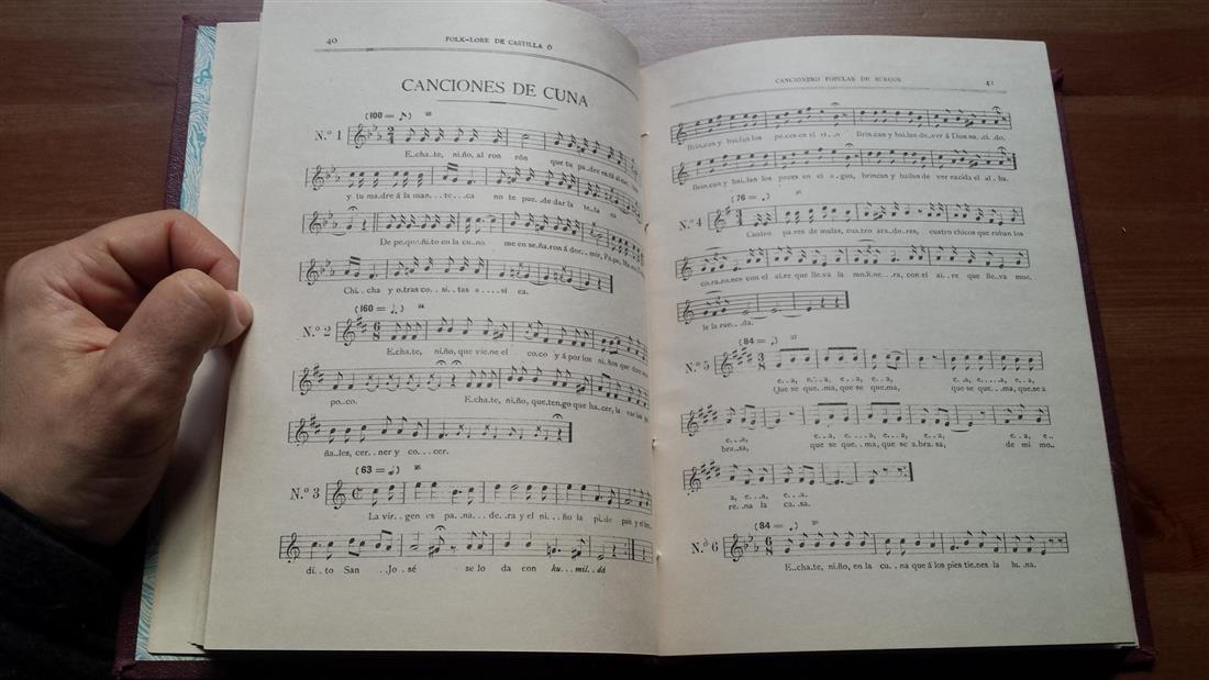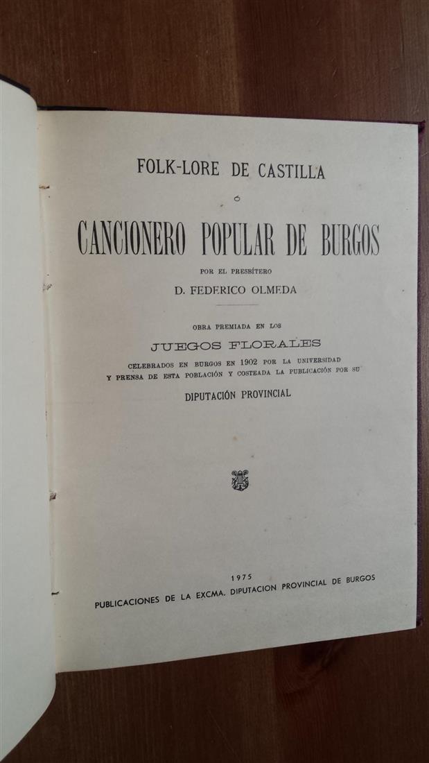 Autor: Federico Olmeda San José (Burgo de Osma, 18 de julio de 1865-Madrid, 12 de febrero de 1909) fue un folklorista, músico y presbítero español. ------------------------------------------------------------------- Título: Folk-lore de Castilla Cancionero popular de Burgos por el Presbíterio D. Federico Olmeda Obra premiada en los Juegos Florales celebrados en Burgos en 1902 por la Universidad y prensa de esta población y costeada la publicación por su diputación provincial ------------------------------------------------------------------- Lugar y Fecha de Publicación: Burgos, Diputacion provincial de Burgos, Imprenta de Aldecoa, 1975 ------------------------------------------------------------------- Páginas: 212 ------------------------------------------------------------------- Dimensiones: cm. 21,8x15,5 ------------------------------------------------------------------- Estado de conservación: Encuadernación con tela parcialmente descolorida, páginas en buen estado, en todos los casos es posible comprender la conservación de las fotografías publicadas, si teneis preguntas por favor contactenos a través de email ------------------------------------------------------------------- Descripción: Contiene varias partituras. Ver título y Fotos ------------------------------------------------------------------- |