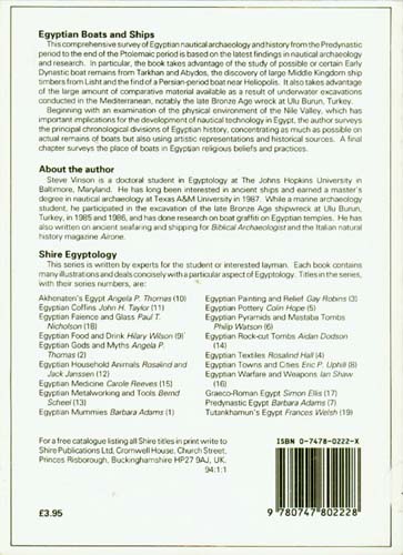 DESCRIPTION: Softcover. Publisher: Shire Publications (2008). Pages: 56. Size: 8¼ x 6 inches; 1/2 pound. Summary: A comprehensive survey of Egyptian nautical archaeology and history from the Predynastic period to the end of the Ptolemaic period is based on the latest findings in nautical archaeology and research. In particular, the book takes advantage of the study of possible or certain Early Dynastic boat remains from Tarkhan and Abydos, the discovery of large Middle Kingdom ship timbers from Lisht and the find of a Persian-period boat near Heliopolis. Beginning with an examination of the physical environment of the Nile Valley, the author surveys the principal chronological divisions of Egyptian history, concentrating as much as possible on actual remains of boats but also using artistic representations and historical sources. A final chapter surveys the place of boats in Egyptian religious beliefs and practices.