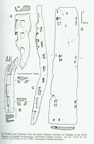 The wood planks were painted yellow on their outside and traces of white pigment have also been found. “A part of the mud brick casing suggests that there could have been a support for poles/pennants on top of the boats, as in the boats depicted on pottery or atop the archaic shrines onto some mace heads/palettes.” This technology for ship construction persisted in Egypt for more than one thousand years and the standardization of this earliest phase of plank boat construction in Egypt is striking. To scholars, the use of unpegged joints seems odd, if not eccentric, and is not found in well established, ancient Mediterranean shipbuilding traditions.