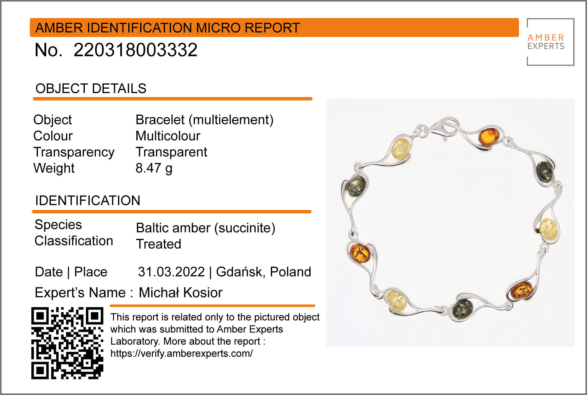 This 7.5" long Baltic amber bracelet features three popular hues of amber set in sterling silver. It fastens with a lobster claw clasp and is a light-weight 8.29 g. This amber bracelet arrives in a soft blue pouch.