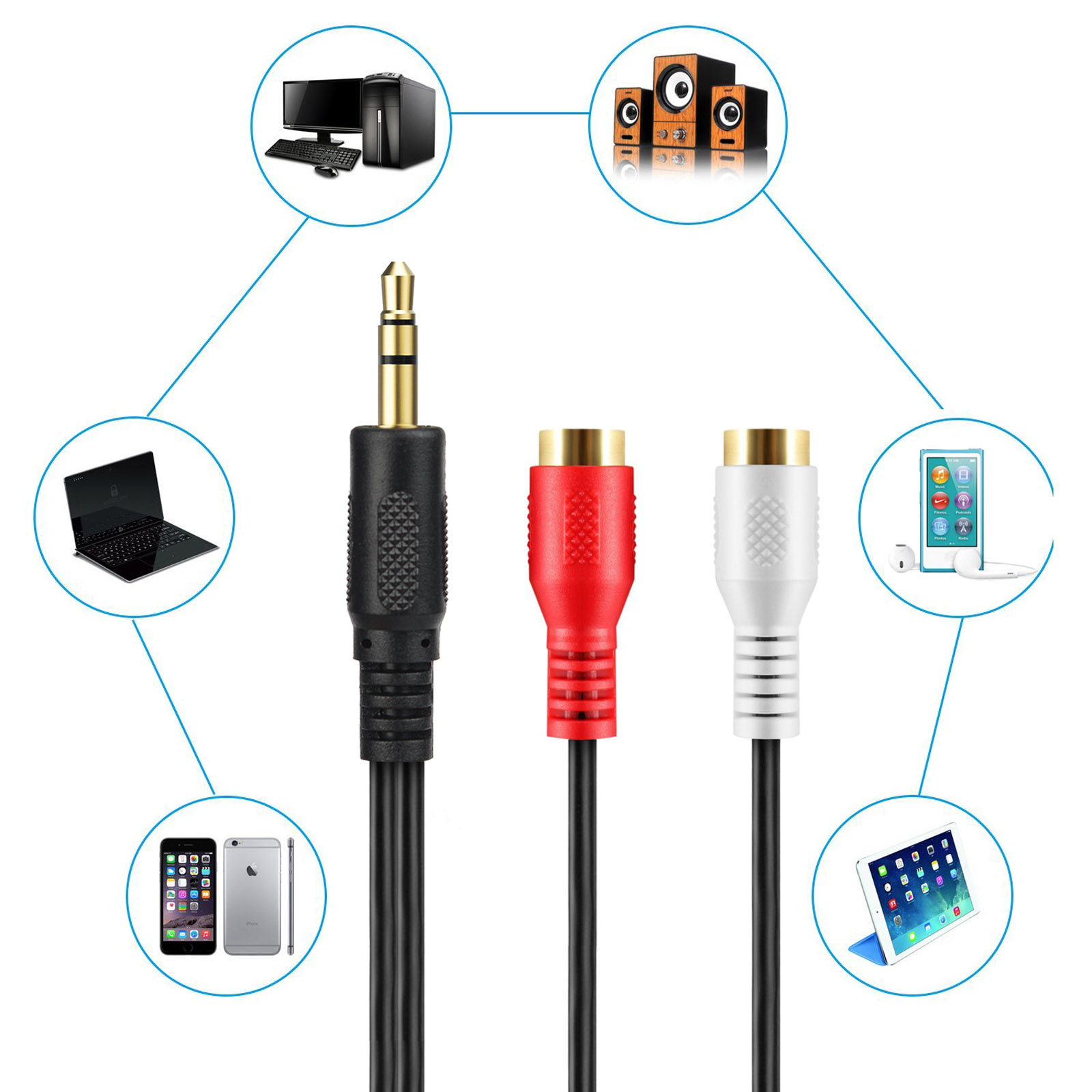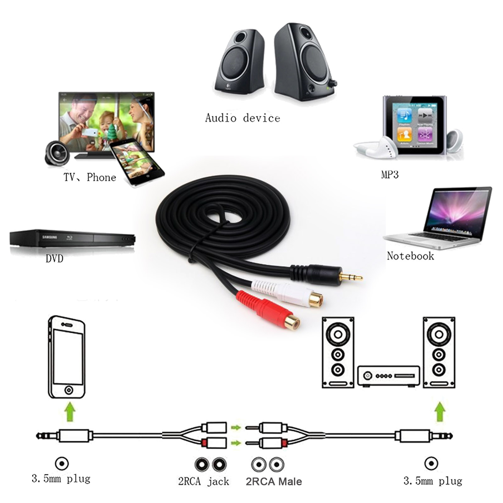 - Stereo to 2RCA adapter connects MP3 players, smartphones, tablets, computers or other audio devices with a 3.5mm auxiliary port (AUX) to your TV, AV receiver, and speaker with RCA input
