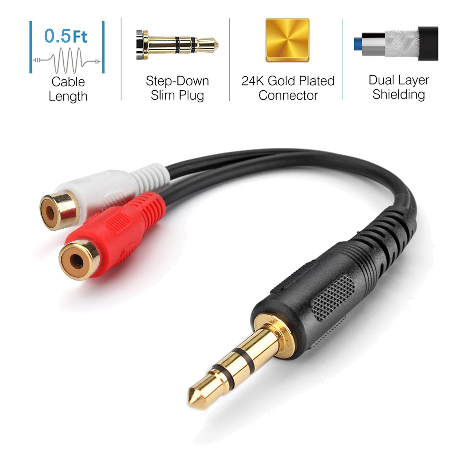 - Gold Plated 3.5mm Stereo to 2RCA Male to Female Adapter