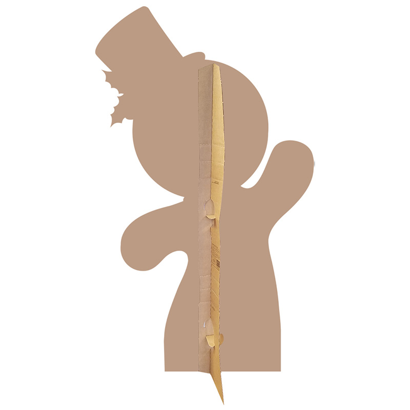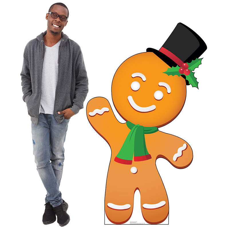 The oversize illustrated gingerbread man on this 5' 5" tall cardboard cutout has a scarf and a top hat with a sprig of holly. He looks delicious!